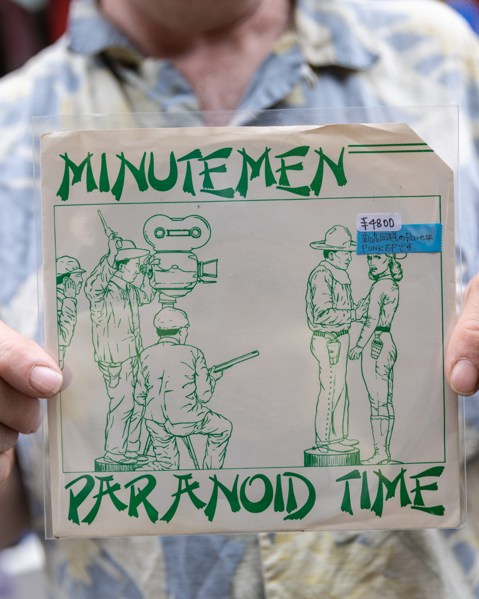 There is one more funny anecdote to the story. We visited Flash Disc Ranch in Shimokita on the day before he was leaving back for the states. Digging in the 45’s he found a very rare Minutemen single, being a bit rich for his blood, he hesitantly passed. We eventually left without scoring much, and I completely forgot that I had missed a chance to add him to Tokyo Record Style. We were simply having too much fun hanging out. Getting back to his hotel, he suddenly regretted not picking up the single, and thought to go back to Flash, but it was already closed and there’d be no time to get it the following day, the flight schedule was tight. He chalked it up as a missed opportunity and we started devising a way for me to maybe get it, and then send it to him, and for him to take a TRS photo when he eventually got it, and send a photo back to me, when suddenly his plane was delayed by a few hours, which meant he had time to go back and score it, which he did, and finally I get add my oldest record-loving homie to my photo project. Brilliant!