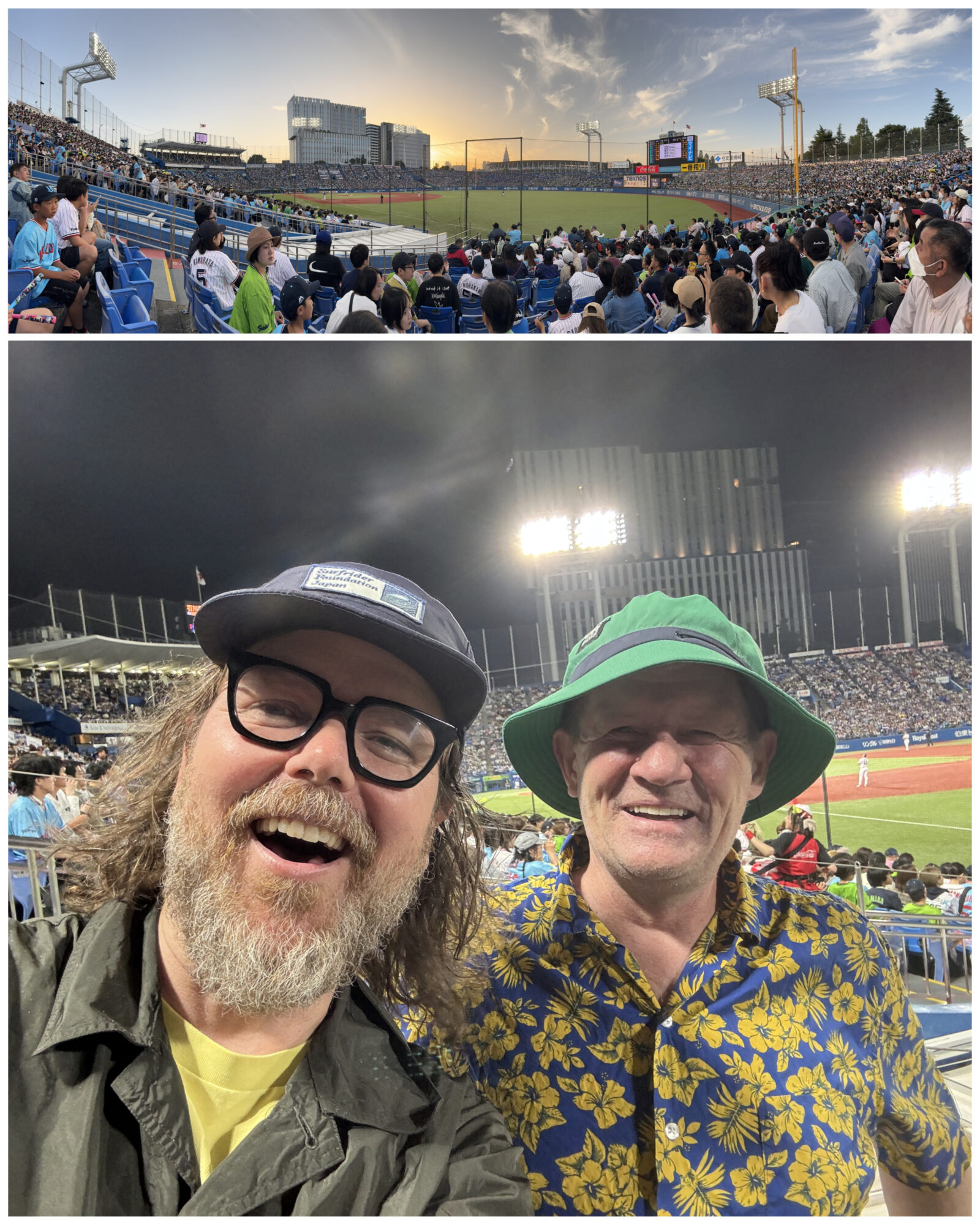 I immediately jumped up outta my seat and scrambling over a few people to get to the aisle where he stood, and gave him a giant hug and bust out my camera in disbelief and snapped a selfie to commemorate the crazy moment. I had completely forgotten he was coming to Japan (he had arrived the day before and was intending to call me after settling in) and it was PURE coincidence we were at the same baseball game! Checking HIS social media during the game, he saw my post and thought, “By god, we’re at the same damn game” and triangulated my position based on the photo, and found me in the crowd. What are the odds!