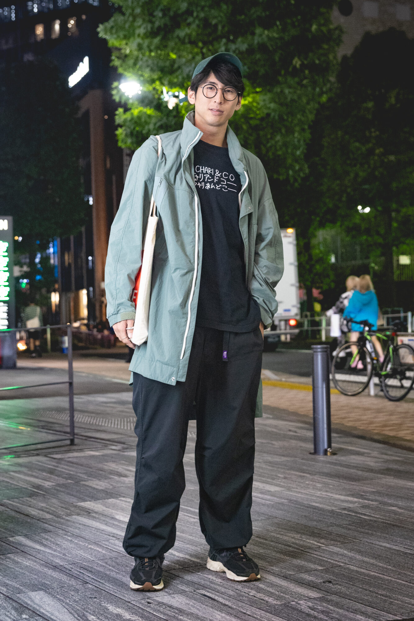Finally, autumn is here in Tokyo and Atsu’s long muted-green jacket I’m guessing was seeing the first action of the season. When I saw it hanging casually off the laid-back shoulders of ball-capped Astu, along with a graphic Tote bag that I wished I had gotten a better look at, I thought to myself, “There’s a photograph…”