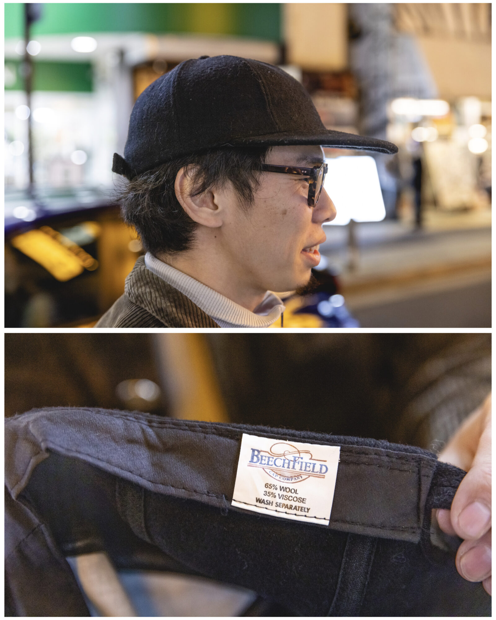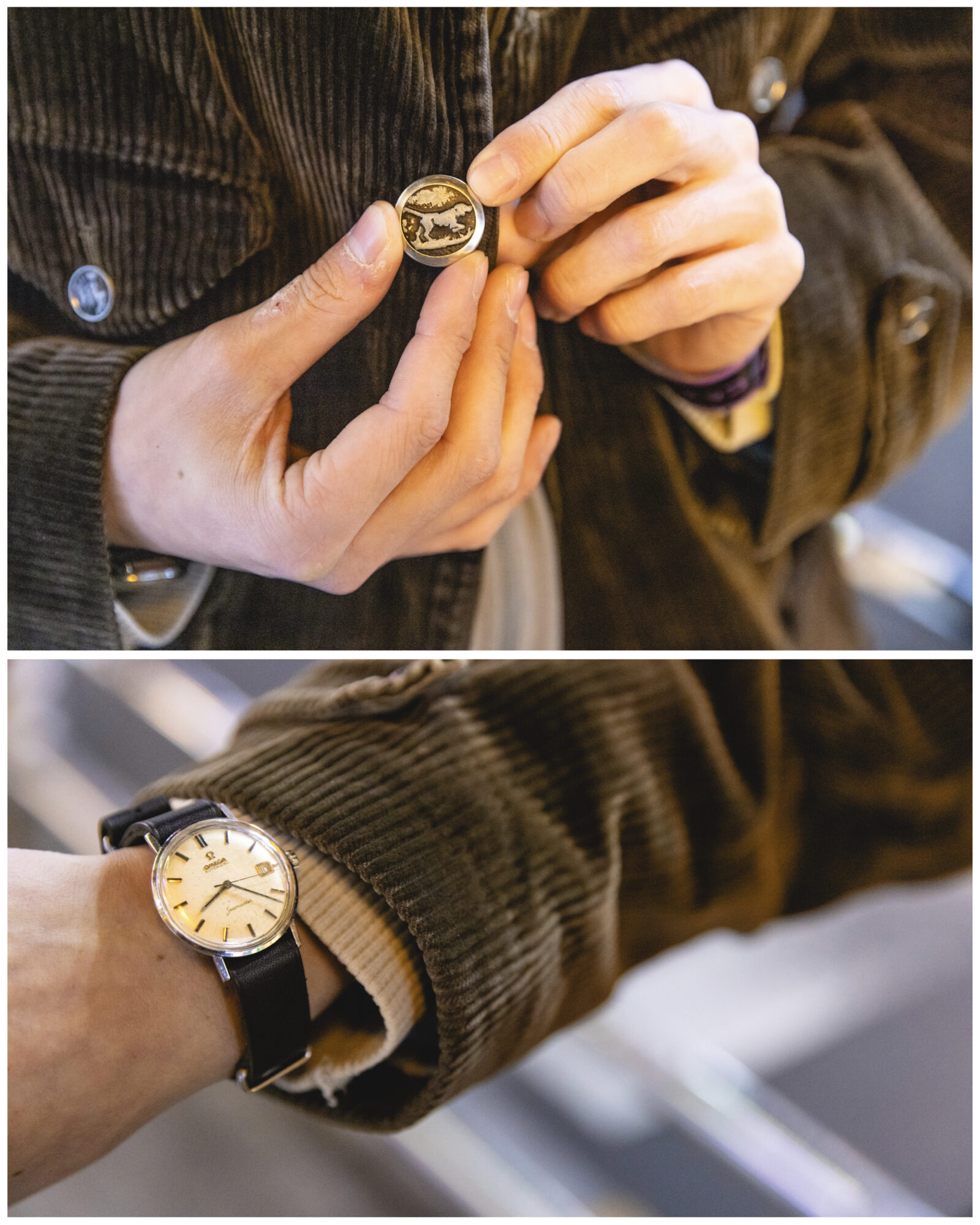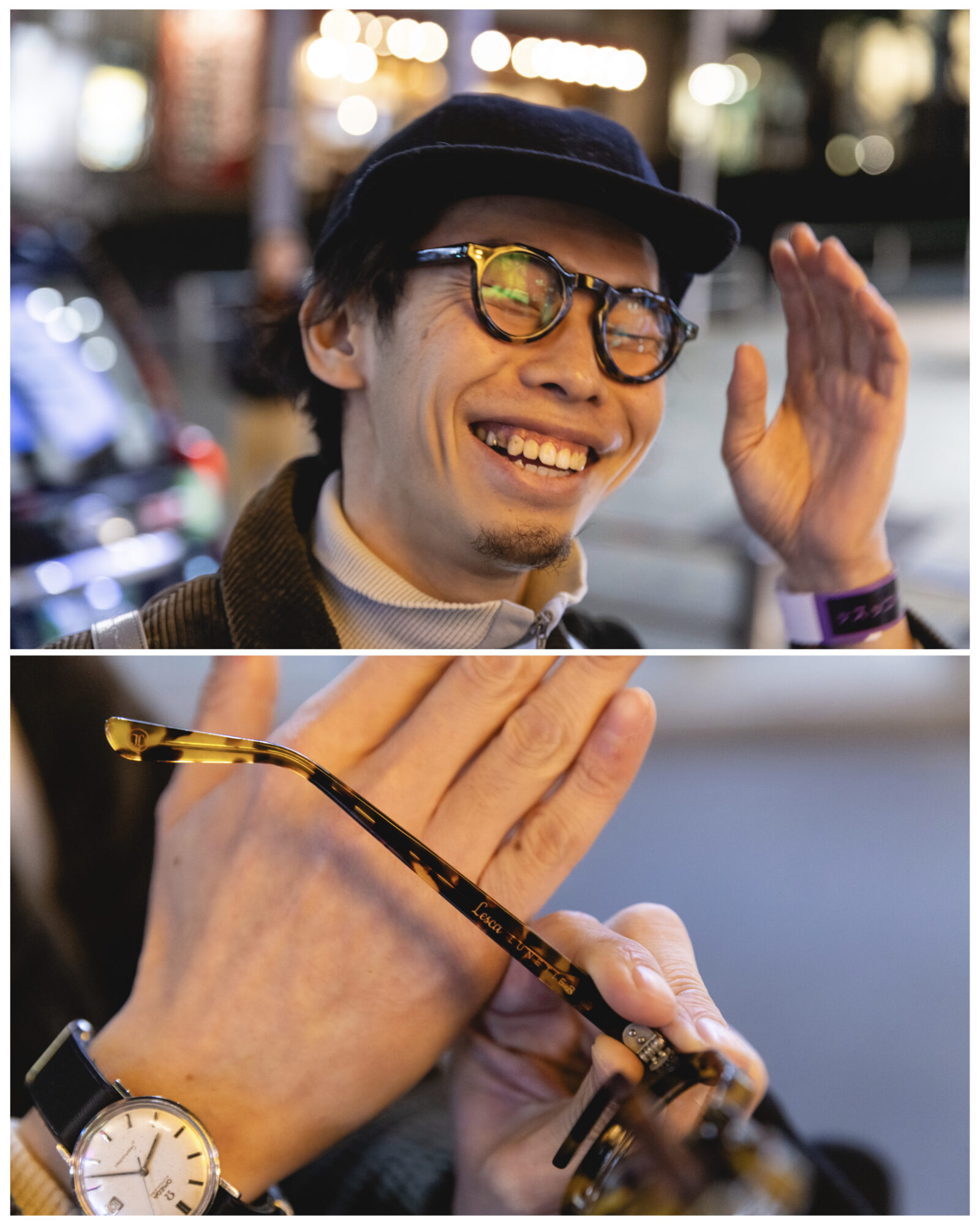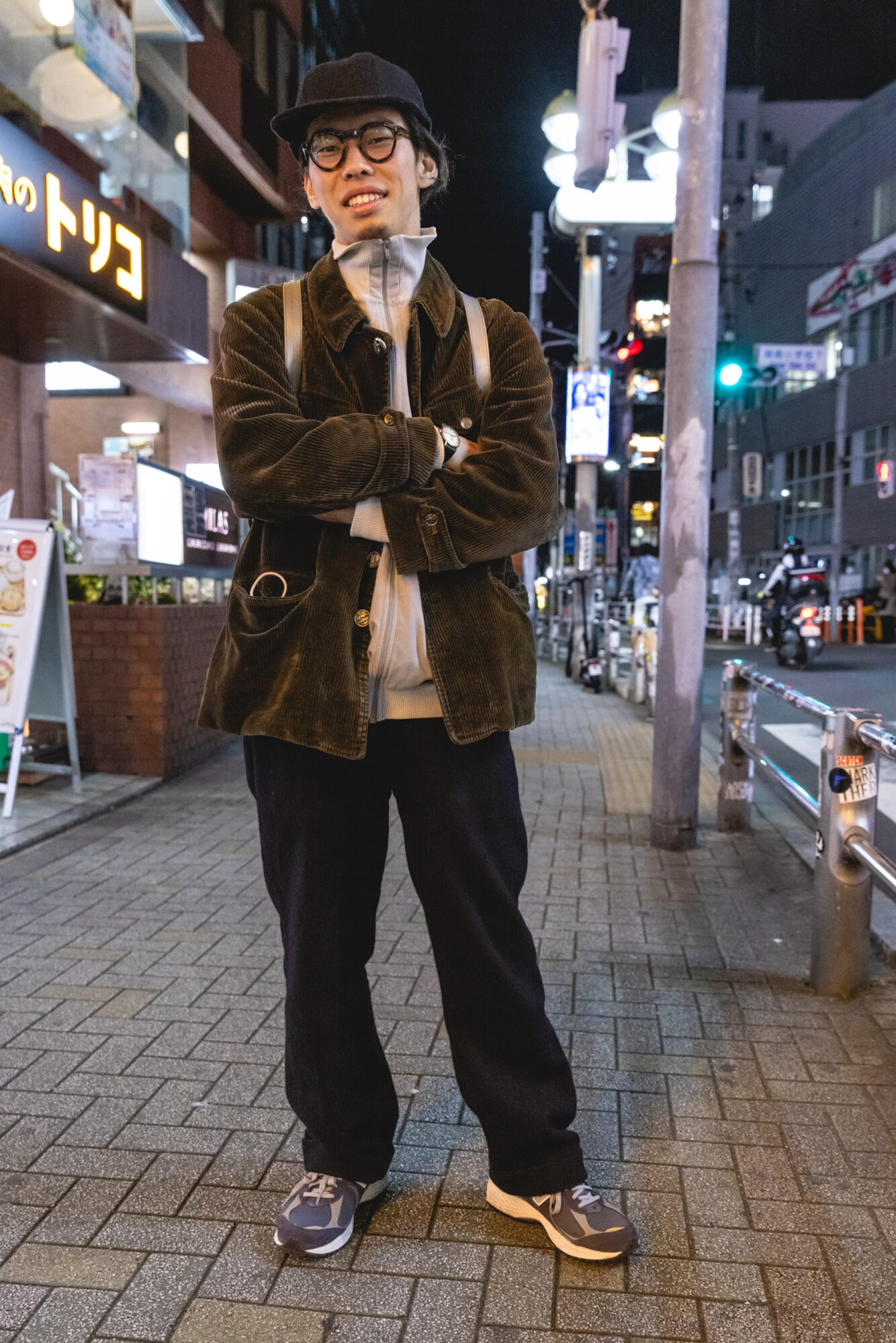 So when I asked Daisuke to tell me a little about himself, he explained that he was into fashion, vintage fashion, specifically French vintage fashion, and when I took a step back to check out his digs with a bit more of a discerning eye, it all became more clear. Daisuke was wearing a beautiful French corduroy hunting jacket from the 30’s for 40’s, replete with hounds buttons! He also sported some vintage British Navy trousers and a seemingly matching wool hat. Handmade-in-France circa 70’s chunky tortoise eyeglass frames from “Lesca” matched a gorgeous automatic Omega Seamaster Date, while some sensible (but no doubt spendy) New Balance 990s went well for a preppy look with the Freitag bag (perfect record-sized).