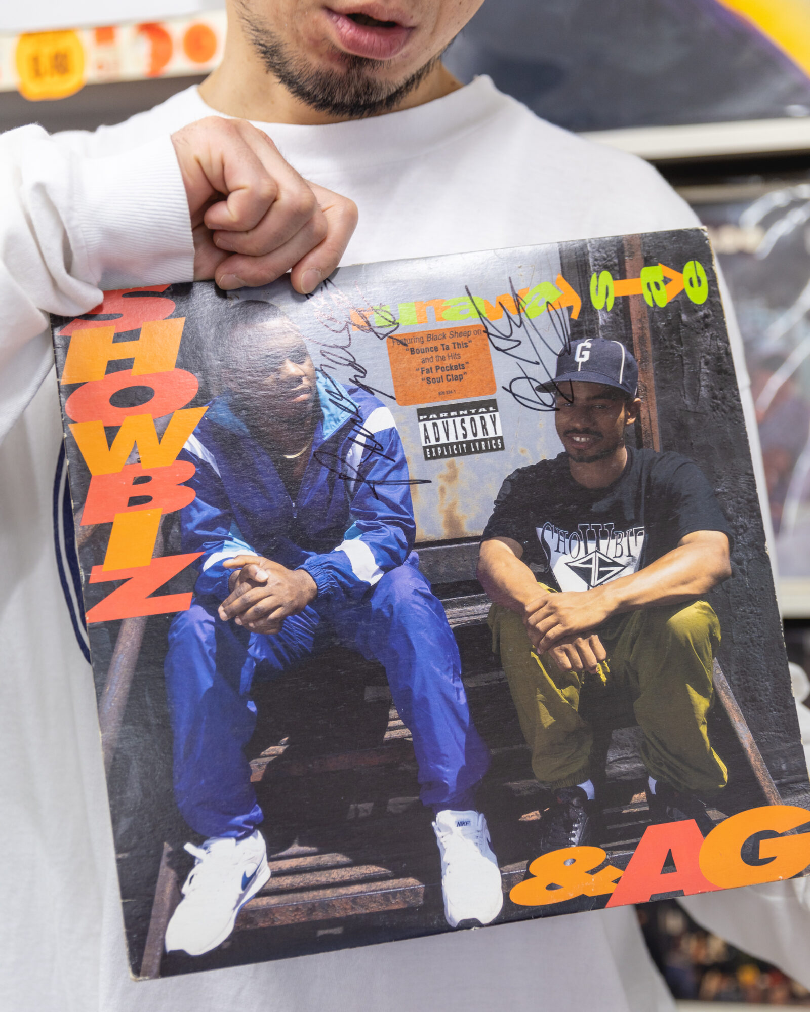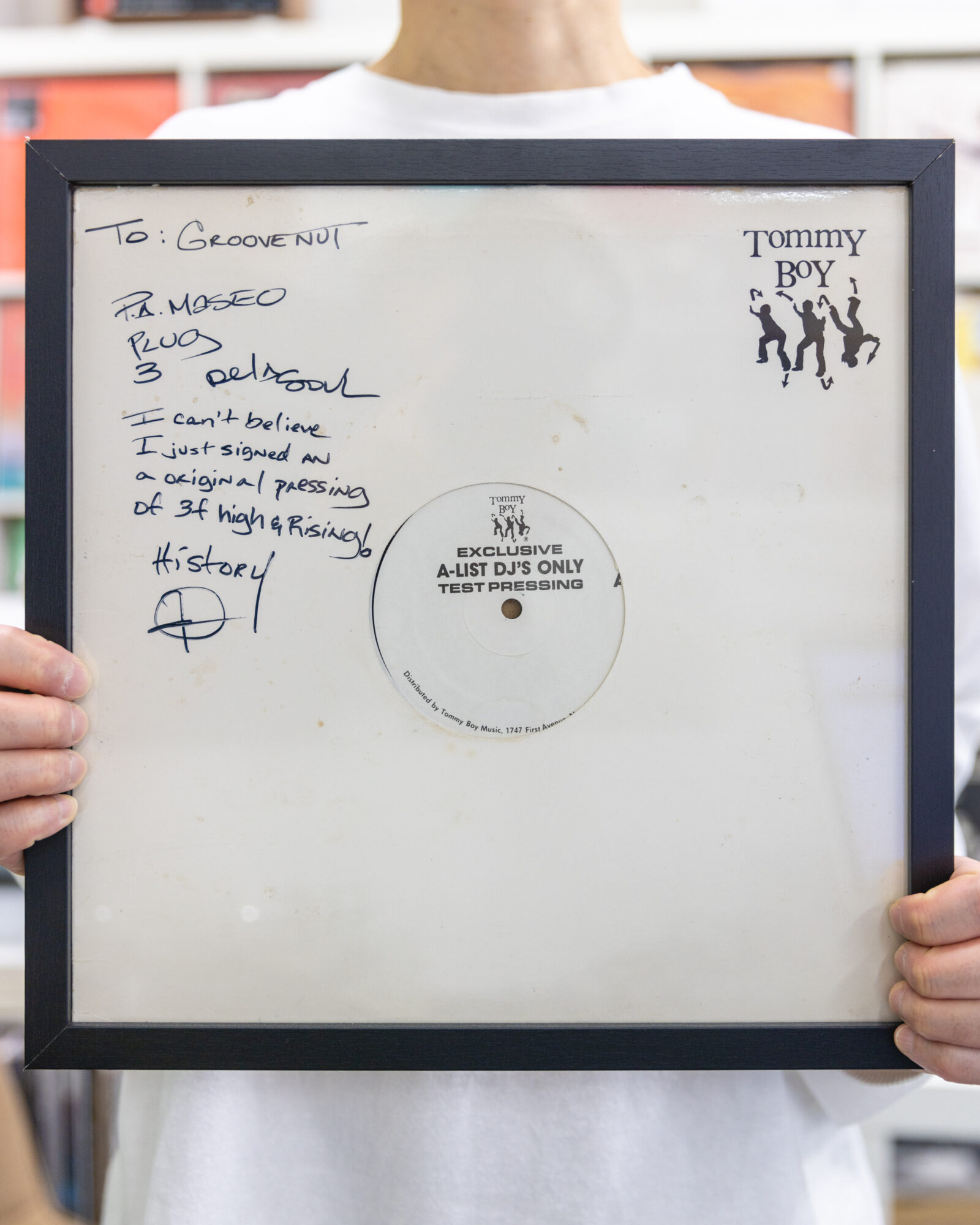 Super cool and shop, stocked with all genres of music, with lots of soul, jazz, and hiphop. With a quick introduction, shopkeep DJ Yasushi told me to just call him Sushi, which gave me a chuckle. Smiles and stories were shared, and I got the abbreviated autobiography of how Yasushi got from Punk to HipHop, from clubbing and DJing, and how Groovenut got started. Somehow we got to talking about meeting some of our heroes and them signing some of our favorite albums, when he busted some signed gems, and this priceless copy of 3 Feet High and Rising and the story of getting it signed. What a tale to tell!