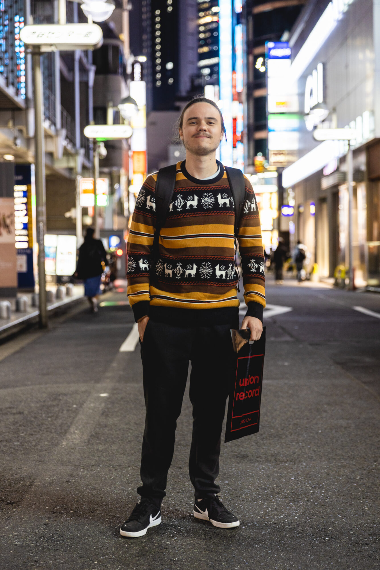 Spotted Guilherm on the streets of Shibuya carrying a Disk Union bag and rawking a pretty interesting sweater. I chatted him up about TRS and in no time he warmed up to the idea of being added to the archive. His ever-so-unfamiliar accent left me guessing where he was from and as soon as I asked, he offered that he was visiting from Brazil, I lit up with excitement!