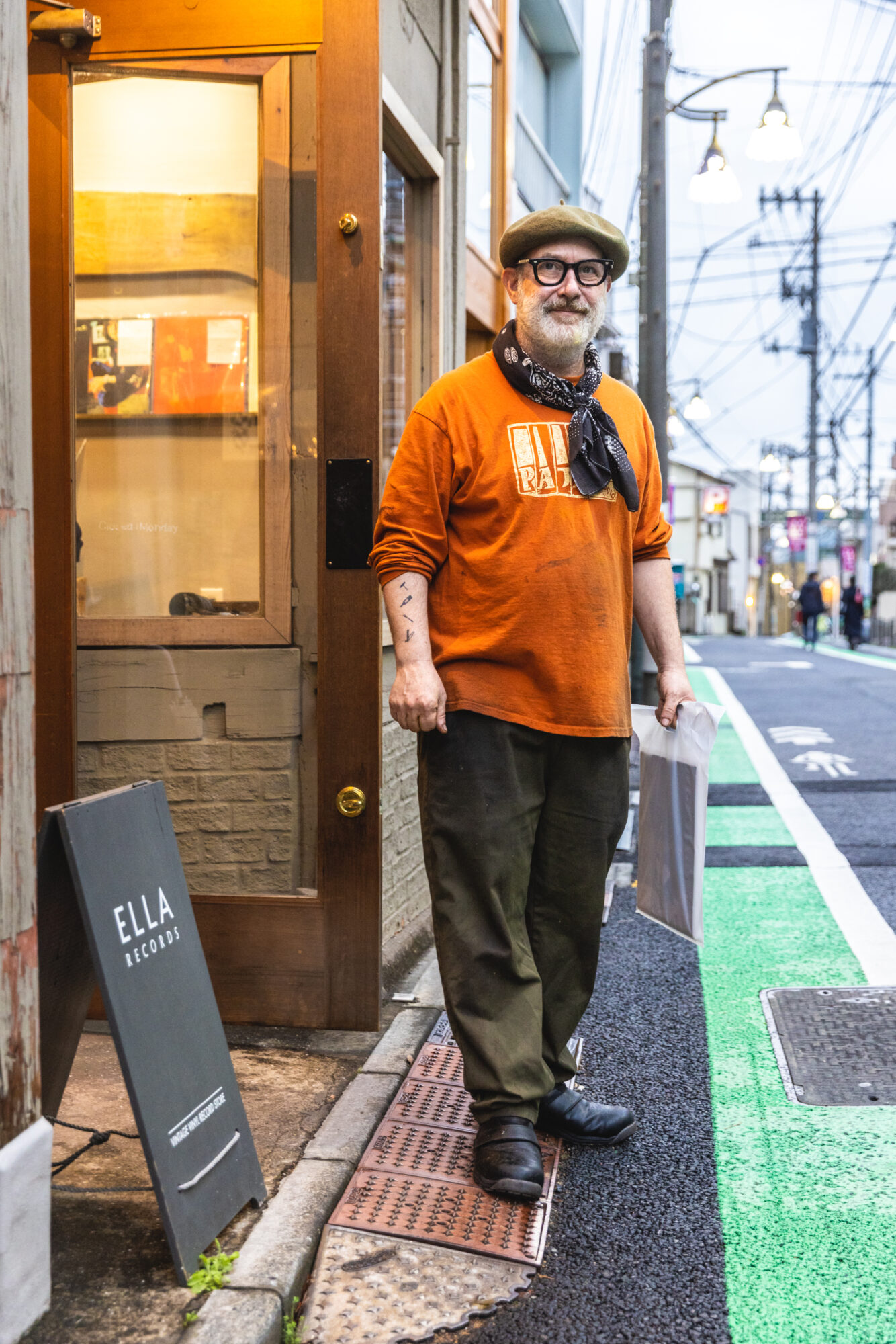 After catching a social post that Ella Records had gotten in a Taj Mahal record that I had been looking for for a while, I stopped over with the intention to just pop-in and pop-out with the one record. In the short matter of time that it took me to dig through the New Arrivals section to find it, there was an even faster whirlwind of a fellow gaijin that blazed in, rawking a felt beret, an oversized neckerchief that my bandana-discerning eye suspected might actually be some sorta middle eastern kufiyya, and a heavyweight long-sleeve t-shirt shirt that was, …ahem, respectfully speaking, as grimy as it was orange, with tattoos peeking out the rolled up sleeves. Having served several tours-of-service-industry-duty myself, and with my behind-the-counter-greasy-spoon-diner-rat credentials, I immediately recognized that grime as kitchen schmutz and this ensemble as “Line Chef Chic” but before I could piece together any more details of this beguiling character, within a single minute, he has already grabbed Digital Underground Sex Packets, a Harry Mudie Meet King Tubby record, and was at the counter checking out. I hurried up, found my Taj record, and got in line right behind him, hoping not to miss the chance to chat him up and make a photo.