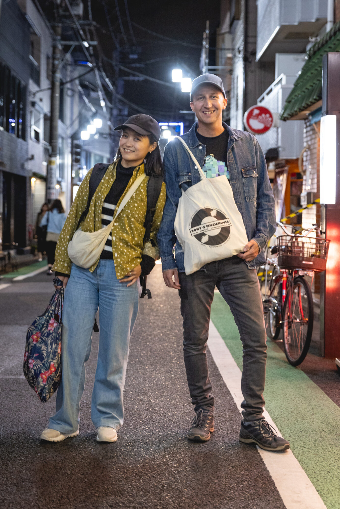 There I was, disappointedly leaning against my bike in front of the adjacent combeeny. “Well, I guess at least get a “Zero Beer” which I did, and drank on the street, lamenting not making the music connection that I had really been looking forward to. “But wait a sec!” I thought, “What’s this coming up the street? Is that a… record store bag? Maybe there is still hope! … Hold on! Now that IS a record bag but it sure dun’t look like there’s records in there. Nope. Definitely not. But that IS a picture of a record on a bag. Does that count? Should I stop them? Naw. Yeah. Naw. Oh, what the hell …why not!”