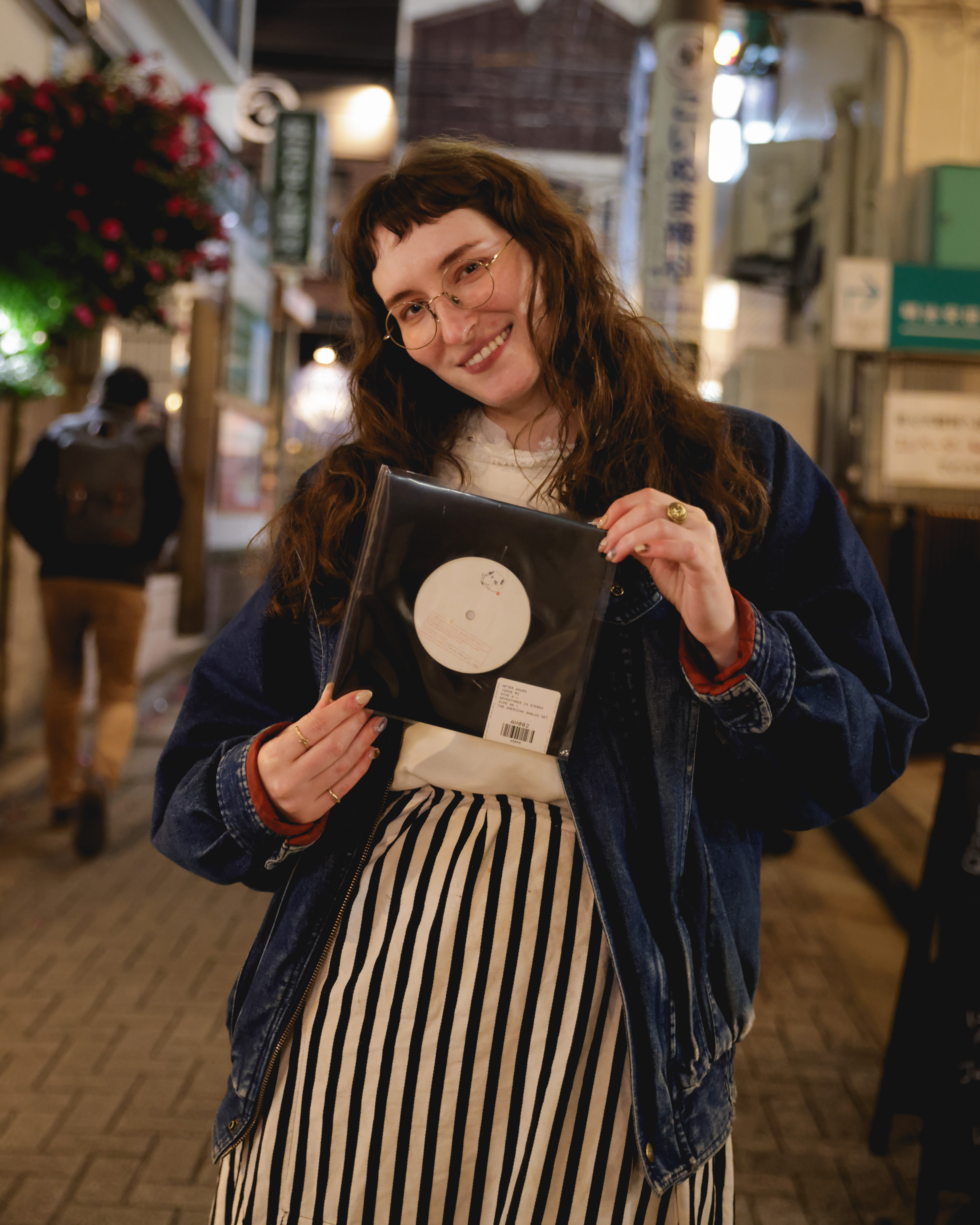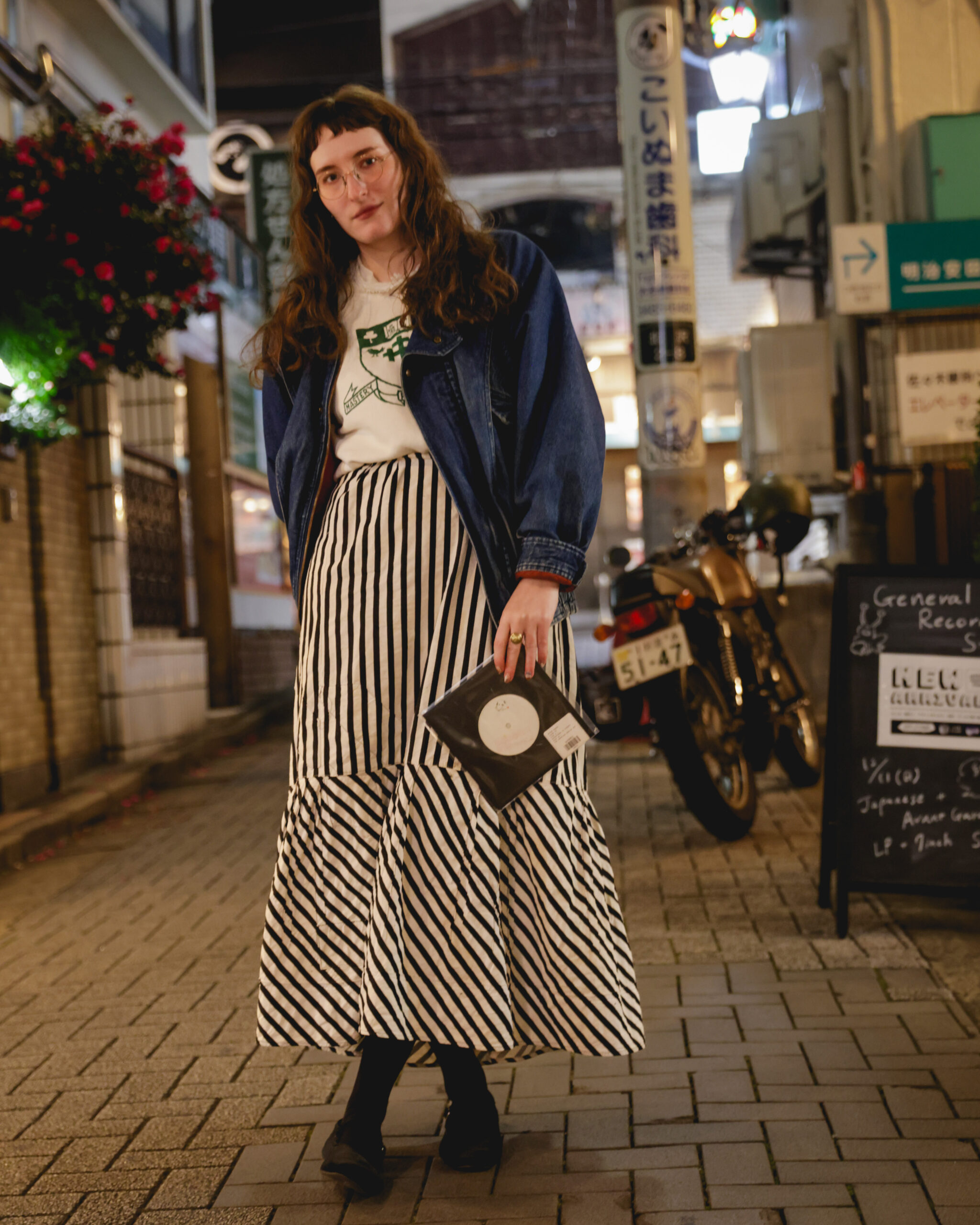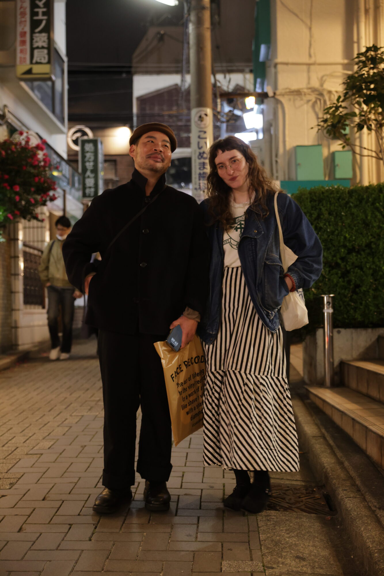 I met Joshua and Madeline near General Record Store, and they were quite the photogenic characters. They had just picked up copies of The Ataris – Blue Skies, Broken Hearts… Next 12 Exits (a guilty pleasure admitted Joshua), and Adventures In Stereo / The American Analog Set – After Hours Issue #2, two more records whose bands I only really know by name. Madeline mentioned that she works in translation and Joshua that he works in fashion. They both were very hip and we had a nice chat on the stoops of General. A couple other things to mention is that Madeline was wearing a skirt from the 1900s and if you check her insta, she has a fantastic feed of modeling many other clothes from maybe from the same era. Joshua said he skates and you’ll find a bunch more of that and other cool stuff on his Insta. Lastly, I shouldn’t say, but throwing caution to the wind, it was a first date! …to the record store! Talk about romantic! Sorry for outting you, but I hope you two lovebirds had a lovely rest of your night 🙂 Thanks for posing for Tokyo Record Style.