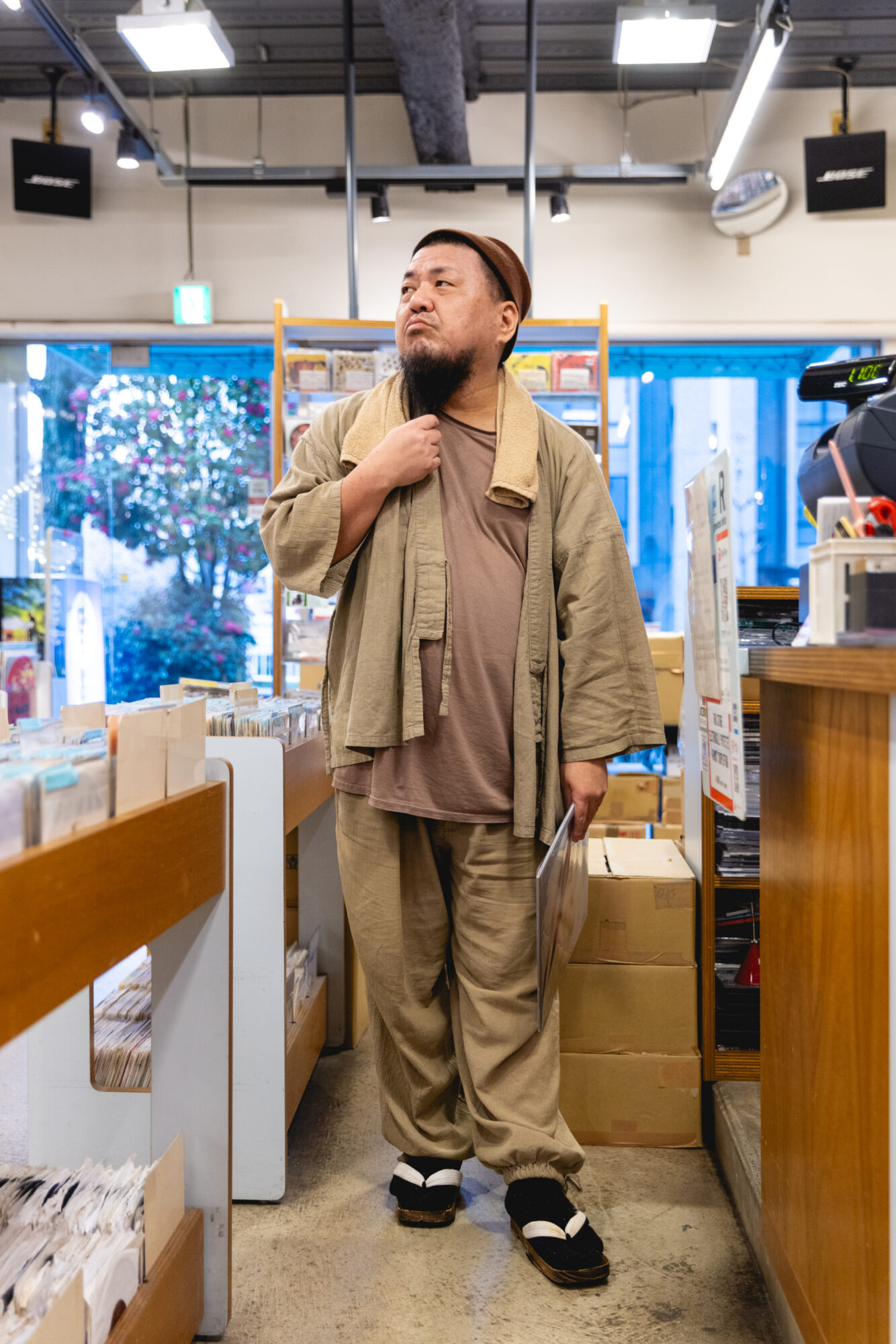 As I was walking into Greatest Hits Records in Nagoya, a customer, Yukinari, from the previous post was walking out. I approached him for a photo and after he agreed we got off to taking some photos. As I was walking backward so as to able to fit Yukinari into the frame, I backed into a gentle looking giant wearing a mono-tone spring linen Japanese Jinbei, a light and airy kimono-style top and loose pants, wooden geta raised sandals with tabi-style socks, a long goatee, a matching terrycloth towel and beanie, smoking tobacco from a thin traditional smoking pipe called a kiseru, that looked like could have told a few edo-era opium den stories. This was Jun san, and he was an enigma, looking both sophisticated and yet bedraggled in the same moment, menacing and yet genial, bruteish and yet elegant, like the Muppet Sweetums or a calm and stoic buddah-esque Santa. I didn’t know whether to apologize profusely for backing into him, or to simply run. But when he gave a wink of his eye, and a twist of his head, a chuckle and a smile, I knew I had nothing to dread.