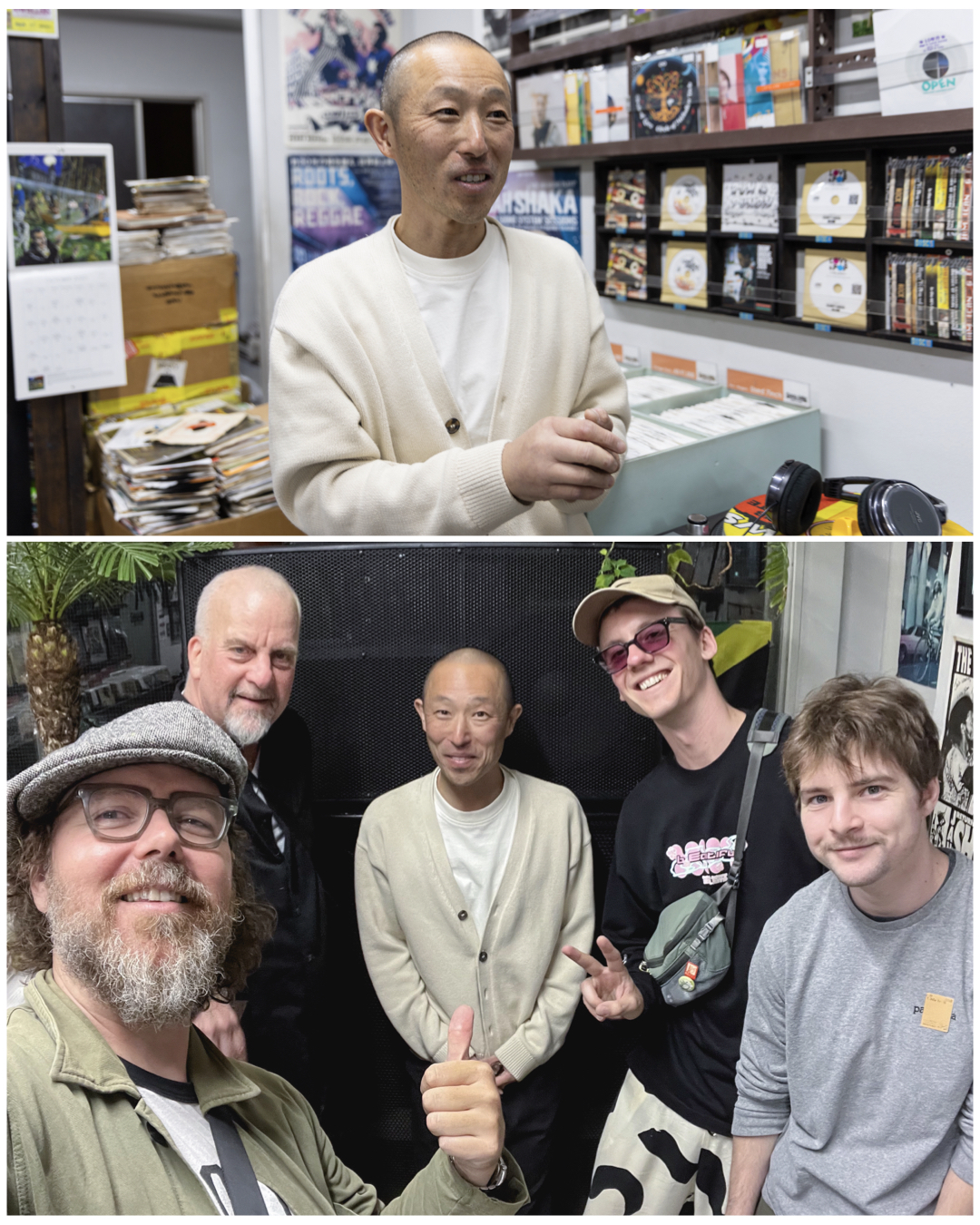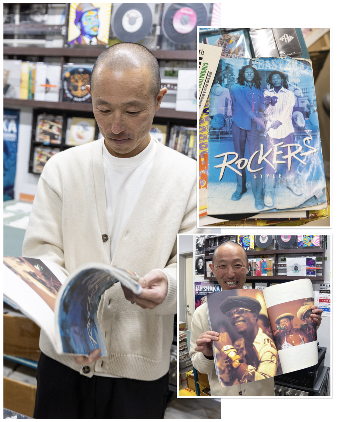 One charming memory I made with Kazuki was when I told him that I really love reggae covers of basically Western pop songs, like reggae versions of Beatles songs, or the like. Wondering if those recordings might be considered cheeky or frowned upon by true aficionados, Kazuki said something akin to, “All great songs are only made better by reggae versions” Haha! Another nice memory I made with Kazuki was during “Tokyo Records Style Day Vol. 6” last weekend when after a really fun hang and dig with some like-minded music-loving homies, Kazuki busted out some Rockers fashion magazines and a Dancehall book maybe from the 90s for us to check out – they we were chock full of amazing visual facets of Jamaican style. I was truly transfixed. Sooo cool! It was right about then when I stopped to take notice of Kazuki’s own dapper threads. Hey, with that simple yet supremely stylish cardigan, you’re looking properly fresh, Kaz! (Can I call you Kaz? haha!). Good grief, you belong in that Rockers mag!