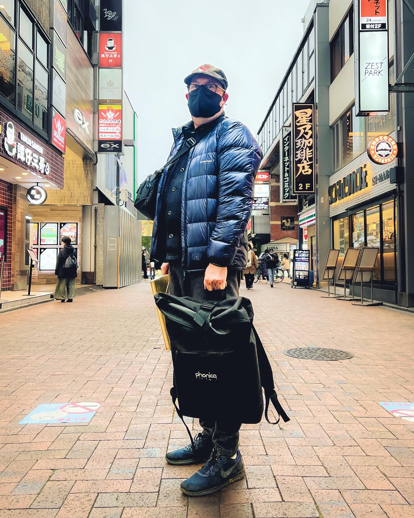 I spotted Kieron in the corner of my eye digging around the 90’s Alternative/Grunge/Shoegazer at Coconuts in Kichijoji. I noticed he had some interesting range-finder form-factor camera slung around his neck which should have been more than enough reason to chat him up, but I must have been too preoccupied with the concentration required to dig through 7” singles while looking for a perfect, within-budget ¥300 score. Regrettably, I didn’t say hello or approach him for a photo. But about half an hour later, he caught my eye when I spotted him AGAIN at Disk Union in Parco, packing a stack of recently scored records into his backpack. I thought to myself, “Do I wait to ask until he has everything packed up, or do I interrupt him to save them the trouble of unpacking it all in case he agrees?” It seemed appropriate to wait until he was situated, and then when he was, I did finally approach him and chatted him up about Tokyo Record Style, he, of course, said, “Sure, but why didn’t you ask 5 minutes ago before I just neatly pack up all these records?” Haha.