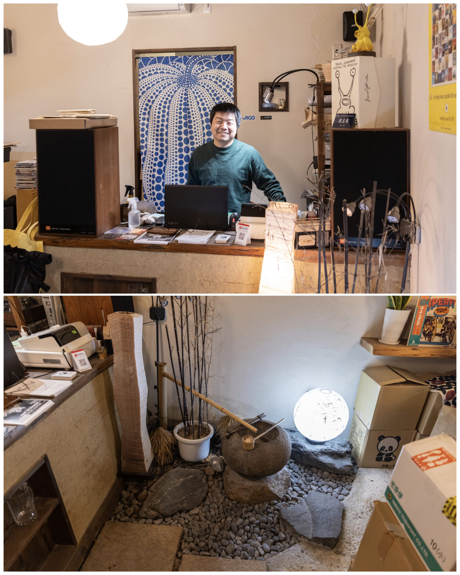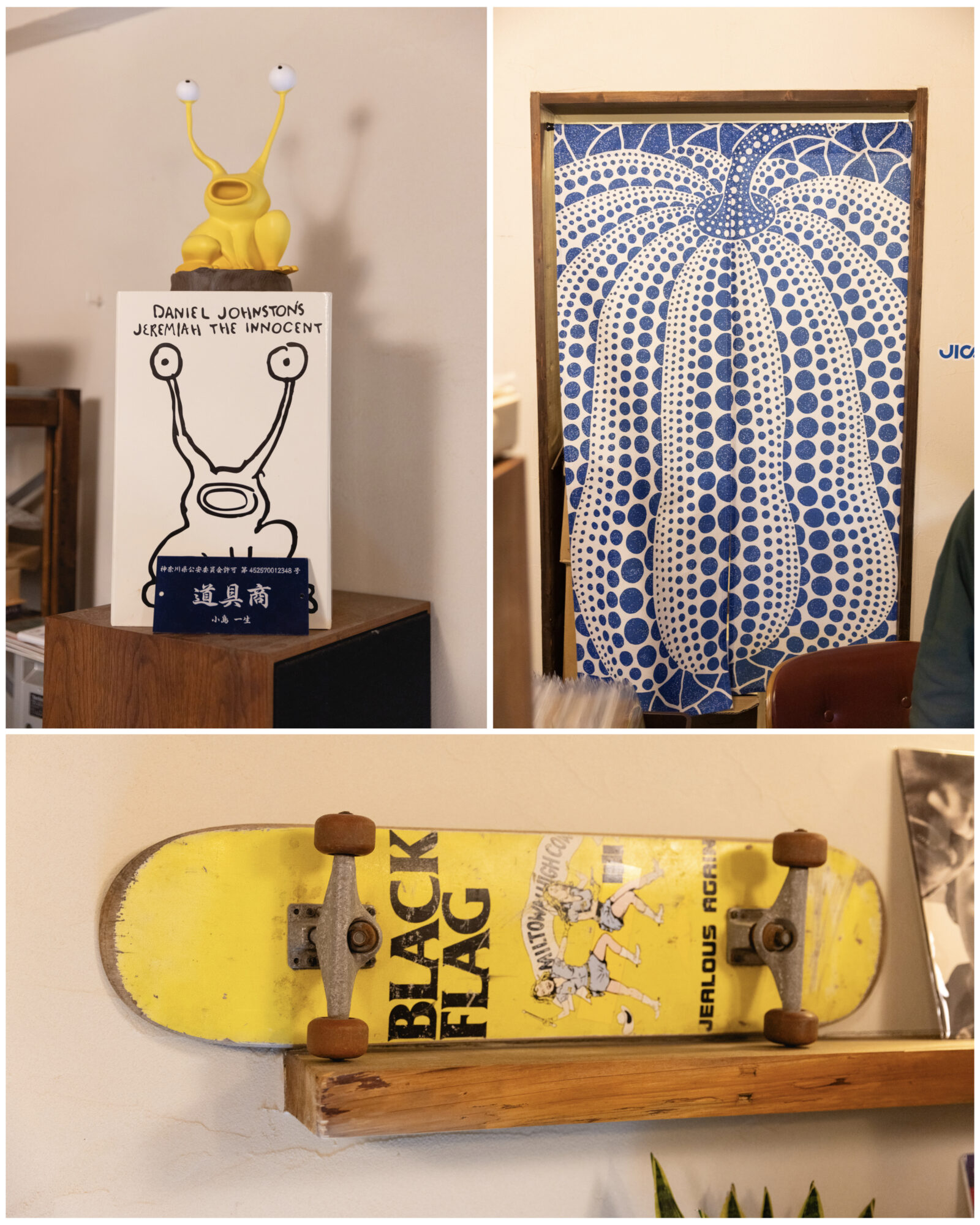 Upon entering Replace Records, we were welcomed with a great scene, heaps of records above and below the racks, a shelf of CDs, a charming little rock garden and paper lantern lighting (left over from the Bonsai Tree shop tenant before), a beautiful blue pumpkin noren curtain divider by dot-obsessed artists, Yayoi Kusama, an actual “Jeremiah the Innocent (Hi, How Are You),” Daniel Johnston Monster sculpture (which is actually a frog in case you ever wondered), a Black Flag skateboard, a pair of JBL4311s, and a really friendly shopkeeper named Kojima san, who not only shared a warm hospital smile and hello, but who mentioned that he was actually expecting us, adding that he already follows Tokyo Record Style, and had been told just the day before by our mutual friend Keesh that a gaggle of record-homies and photography-heads might be showing up on this day. Our reputation preceded us – how about that!