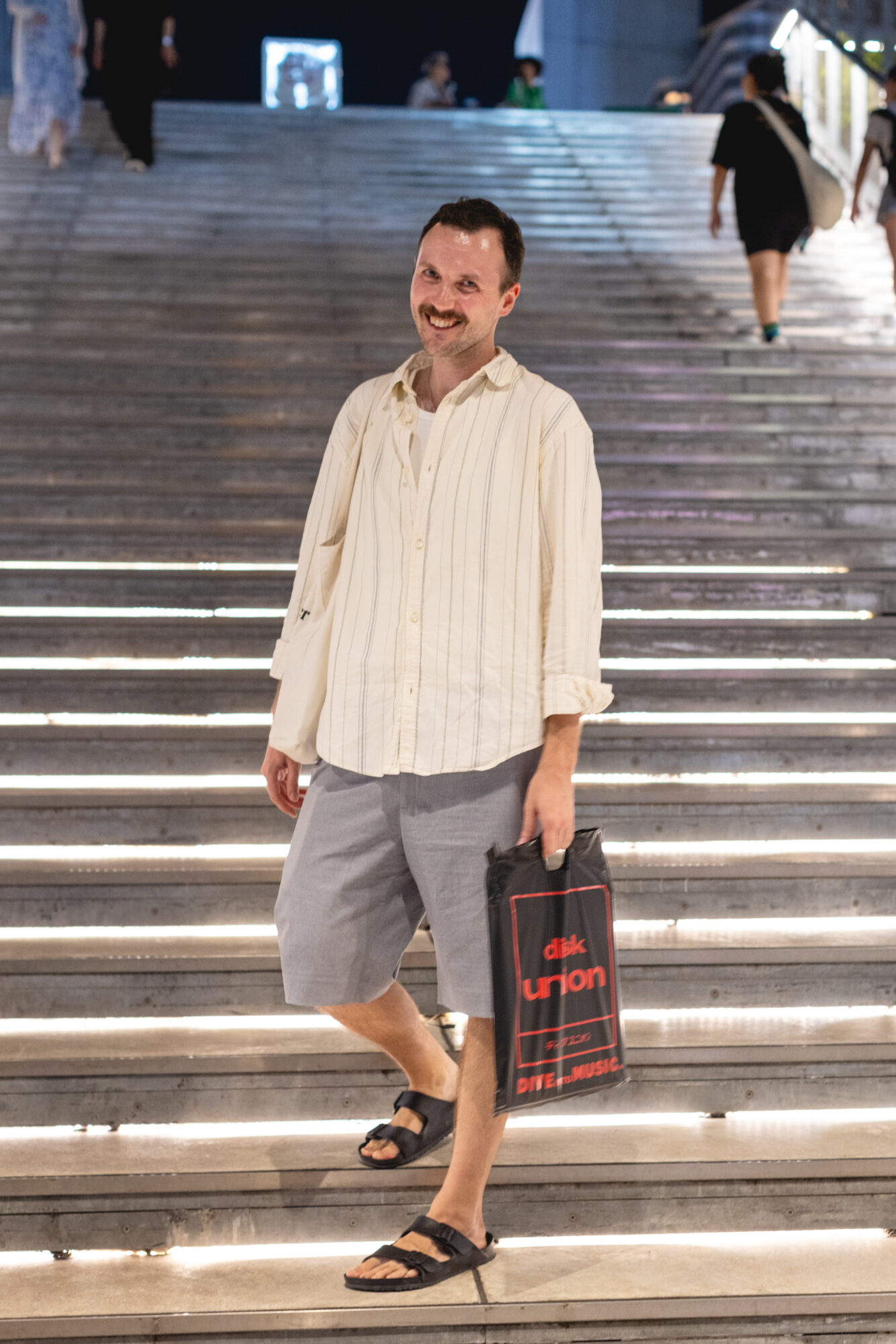 Bumped into Markus visiting Japan for the first time from Berlin where he works for a major record label managing artists and musicians! WOW! It appeared by the contents of his record store bag, which had a smattering of all-genre scores from Disk Union, HMV, and Tower, that Markus was a record-store tear! He was generous with his time with me but I could tell he was keen to get to Face Miyashita before it closed in 30 min. We had a nice short chat and I shot him on the stairs suspended over Organ Zaka that go up to the roof-top park (…still boggles my mind that this was once the somewhat dingy park filled with blue-sheet dwellings where I made many-a-photo, warmed by hands around a trashcan of waribashi wooden chopsticks, drink many of street beers with my fellow broke-ass friends and the blue-sheet dwellers.)