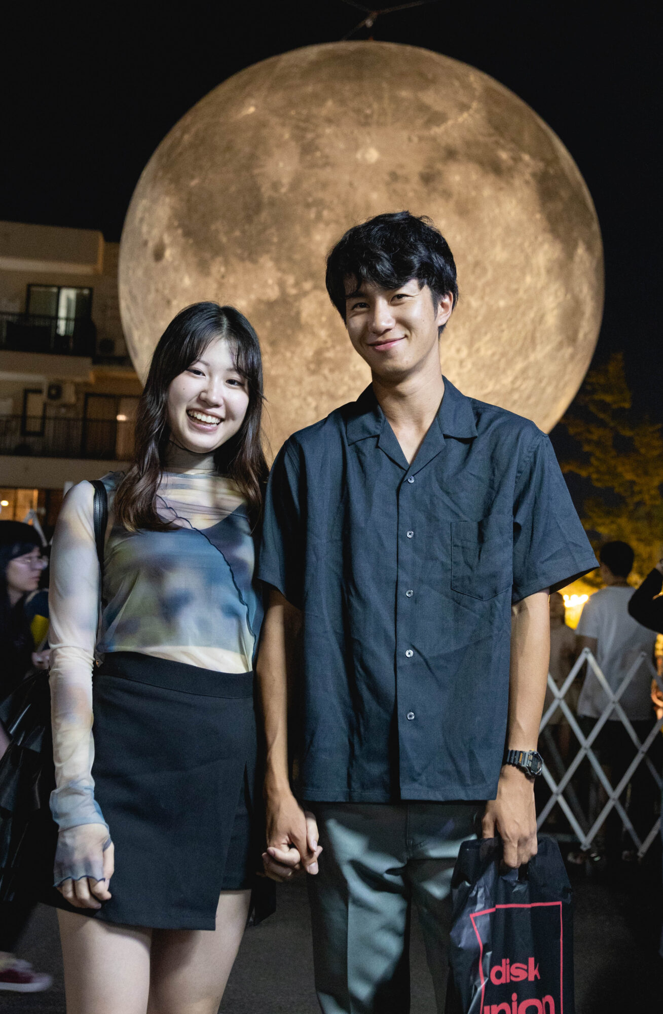 As luck would have it, I bumped into these lovebirds far from their nest in Shizuoka and Yokohama respectively. They were having a date night in Shimokita (I admit my heart is about to explode just to think about it) and I managed to catch up with them under the giant floating moon installation by UK artist Luke Jerram, – titled ‘Museum of the Moon’, hanging for the neighborhood’s annual Lunar festival. The smile-inducing exhibition features really striking photographic details of the moon’s textured surface as captured by Nasa.