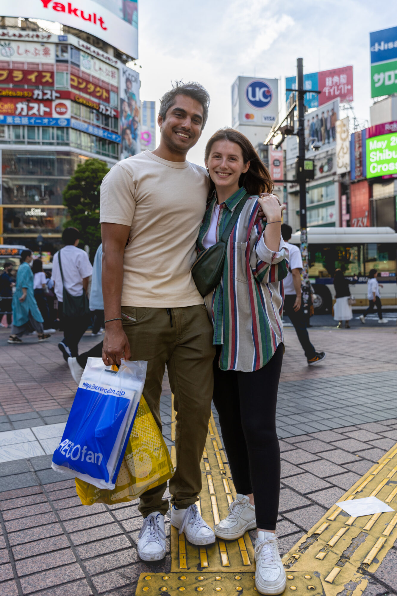 When I locked focus on Reco-Fan bag-toting, Oliva and Adit, photogenically coming through the crowd across the intersection, I knew I had to ask them for a photo, but my humble “Pardon me, Miss. Excuse me, Mister. Are those records?” were inoffensively ignored (to visitors, Shibuya Scramble doesn’t feel nearly as safe as it actually is) as they started to walk past me, naturally not wishing to be hustled, which I can appreciate my pitch appearing to be. I gave them a demure “Just want to chat you up about your records” which perked their ears but not enough to solicit anything but a “Sorry, we’re in a hurry.” I gave them one last “I’m a collector too!” invitation and a harmless “I-don’t-bite” last glance when I saw their barreling train come to a sudden stop. They deliberated for a split second, and turned back around. I’d won them over and the act of sharing music prevailed! YES!