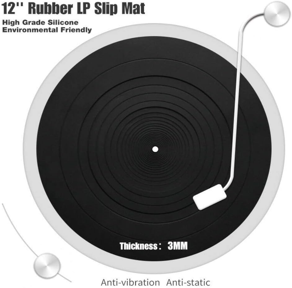 Diameter 300mm Rubber Silica Gel Record Player Mat Turntable Slip Mat Ultra Thin Anti-Static Anti-Vibration Mat (12 inch, black) Effectively control the vibration generated during turntable operation and reduce rear noise. Reduces vibration, increases record adhesion and decreases cash register Consumables to keep discs clean Anti-static, reduces impact and prevents scratches on vinyl records.