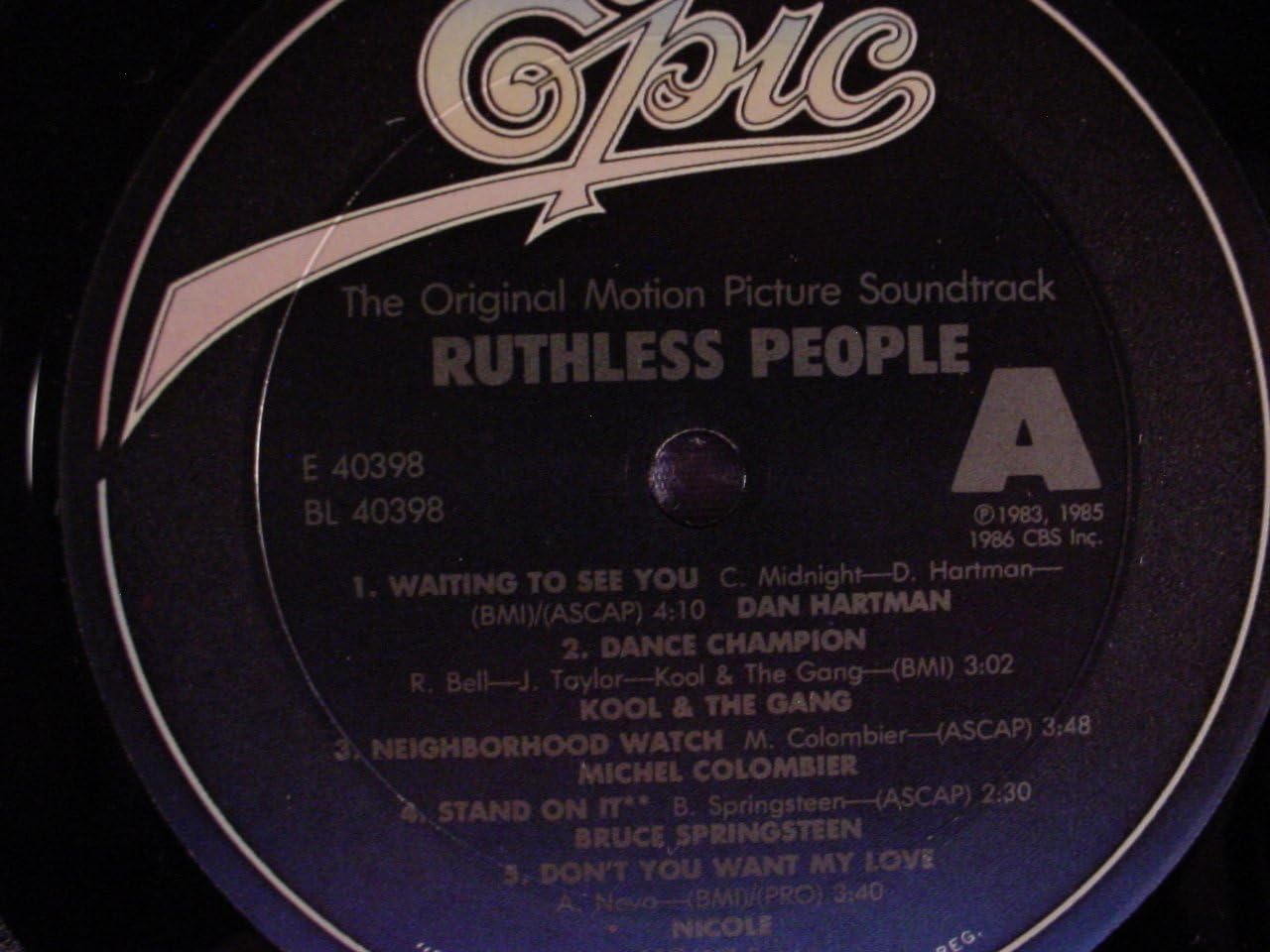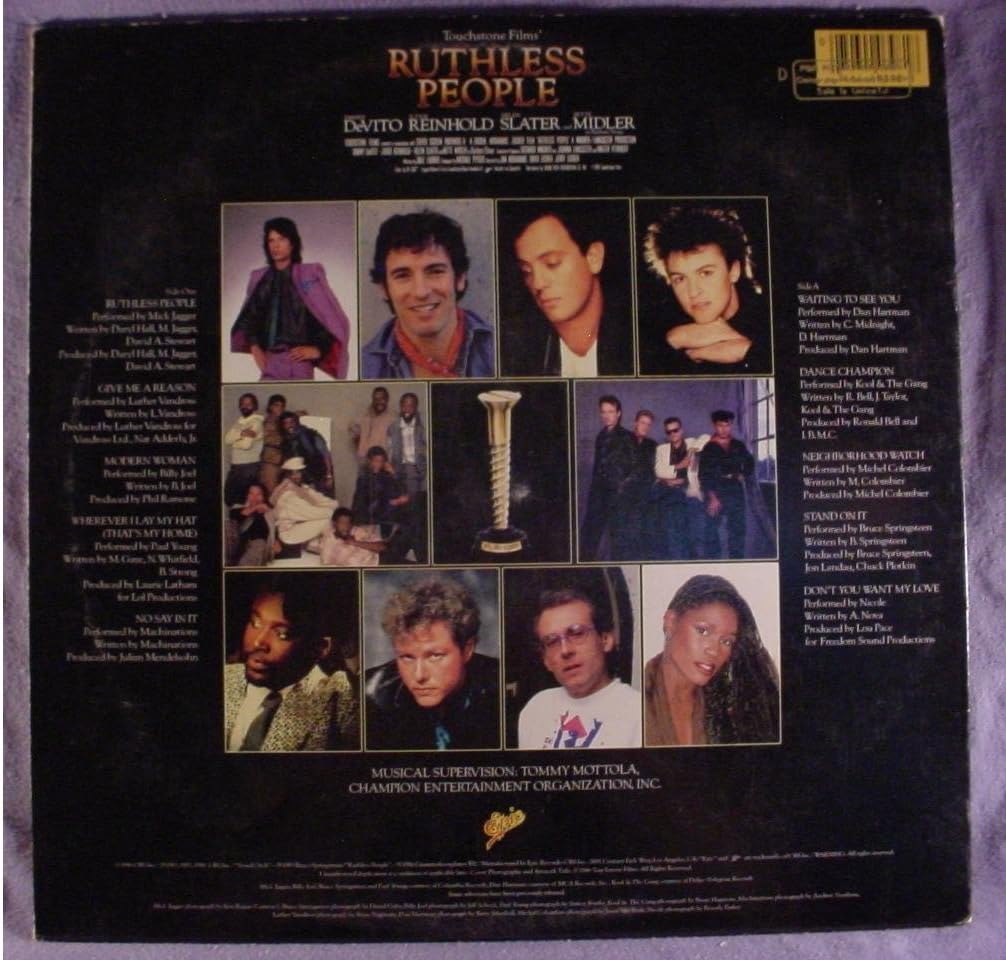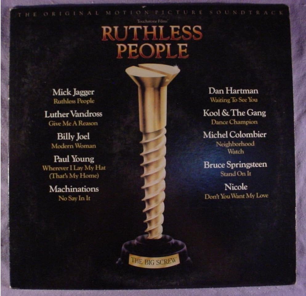 ORIGINAL SOUNDTRACK Ruthless People (1986 UK 10-track vinyl LP featuring the music from the original motion picture soundtrack including tracks by Mick Jagger Luther Vandross Bruce Springsteen Billy Joel & more. Apart from a shelfwear to the edges the glossy picture sleeve shows just a little light shelfwear and the vinyl remains in excellent condition EPC70299)