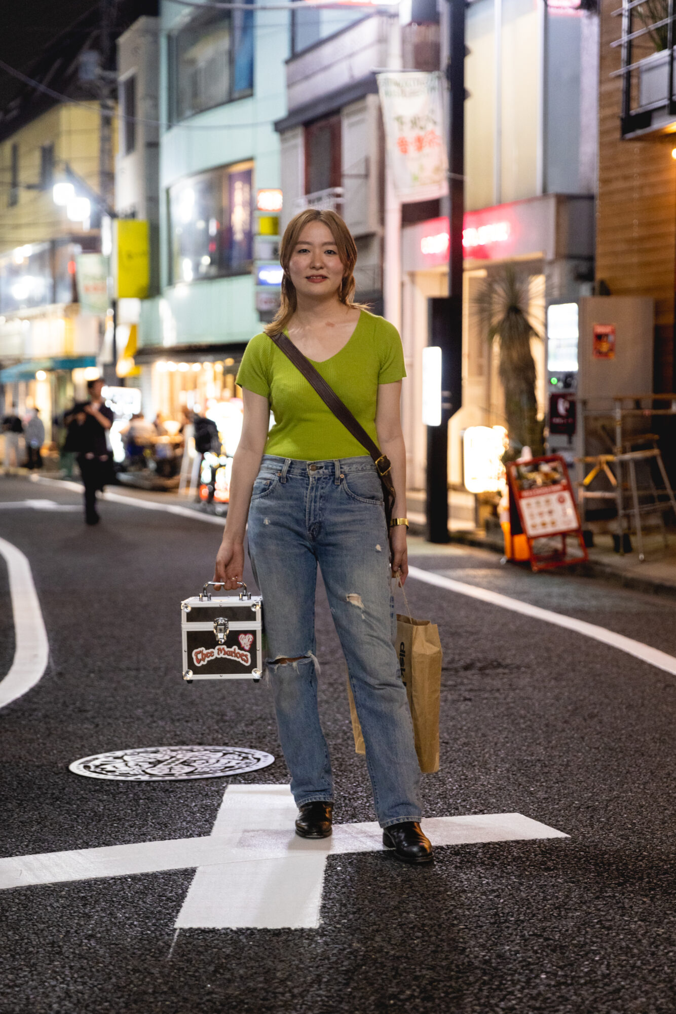 ALERT: Cute young woman, wearing holy jeans, 70’s green top, black boots, gold watch, bleached blonde, walking down the streets of Shimokitazawa, carrying a matchingly cute and sticker’d 45 case, loaded with deep cut Soul 45’s and a brown paper Disc Union sack full of equally soulful 33’s, en route to local DJ gig. Uh… Can you get any cooler? Um. No… No, you can’t.