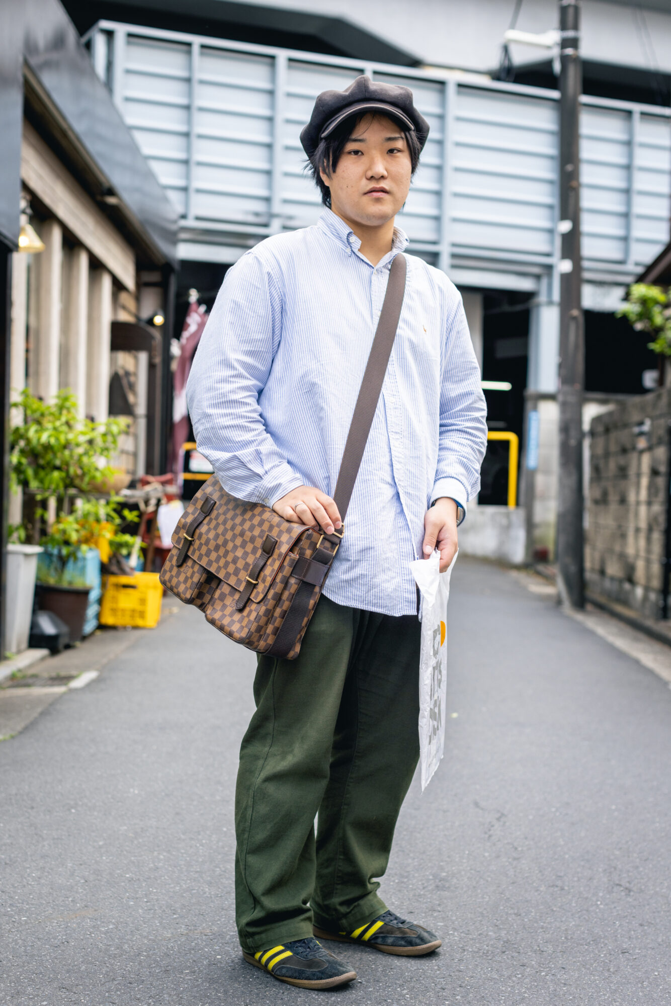 Sho wondered back and his preppy 90’s throw-back style instantly caught my eye. Some yellow-striped Adidas Sambas both perfectly matched and contrasted the muted tones of the rest of the ensemble. Dark Green chinos and a Polo pinstripe knit oxford were a solid casual foundation for the sneakers, the newsboy cap, and holy smokes, stop-the-presses, a minty Louis Vuitton Broadway Shoulder Bag (2002, I looked it up, nice vintage, Sho. You may have just made me a fan of Damier Ebène, which I never thought I could be ). Then Sho flashed a medicine wheel pendant earring, and a refined Franck Muller timepiece, the Casablanca, blue dial if I recall. The orange dot and the bold Coconuts font on the vinyl bag tied it all together. Damn, Sho! Decked out in full regalia. Looking goooooood.