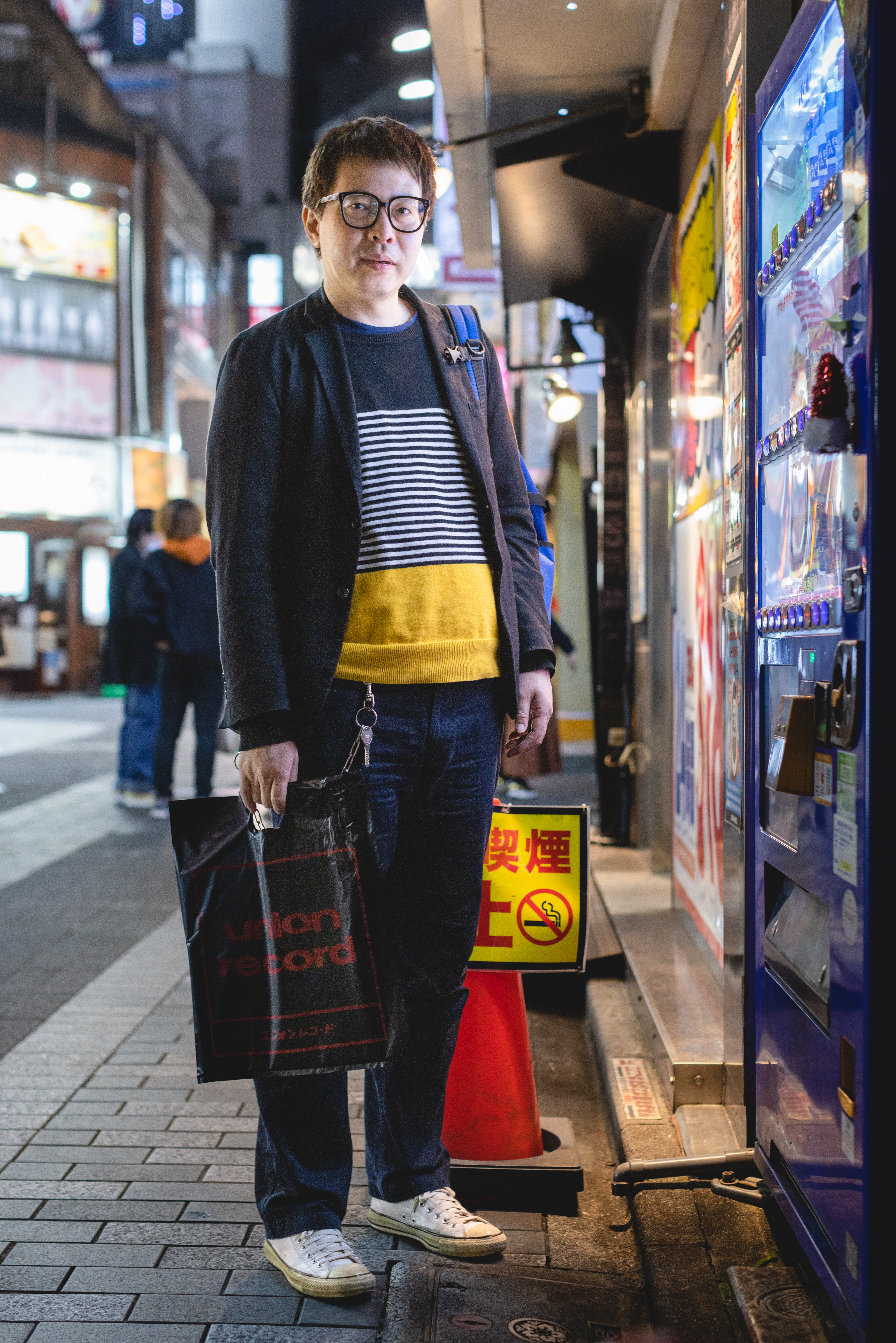 Takashi’s striped sweater had something Charlie Brown about it, his chain wallet and oversized rims had something Elvis Costello about them, and I have always wanted a pair of leather Chuck Taylors. Carrying a Union Record Bag, naturally, I had to spark up a conversation with him. I told him about Tokyo Record Style but he was expectedly hesitant to just pose for a stranger with a camera. That’s understandable, but since we were already talking, I asked what records he just scored and he pulled out the Ronettes! That very day, I had spotted Phil Spectors’s Christmas Album on Garageville’s Instagram and called up Yasu and asked him to hold it for me (which he did and which I would eventually pick on the weekend and have been listening to it non-stop since), so anyway, I was keen to talk to Takashi about the Ronettes and why he collects records and what kind of system he listens to his records on, ad CDs and lo-fi, and so on, and so on. We had a nice chat and he told me he plays in a band called “Car Crash” and he told me about a cool Rock & Roll Record bar in Shimokita that I had never heard of or been to before – Poor Cow …wait, Googling… Just checked and, confirmed, I don’t know it, and it, indeed, looks cool AF. So thanks for that pro-tip Takashi. Well, needless to say, after we had been chatting on the streets of Shinjuku for 10 minutes by then, Takashi warmed up to the idea of a photo and posed with his Ronettes Record – The Colpix Years (1961-1963) …Gotta be a HOT record. Gonna give a listen soon! If you want the details, check the linked Discogs list in bio.