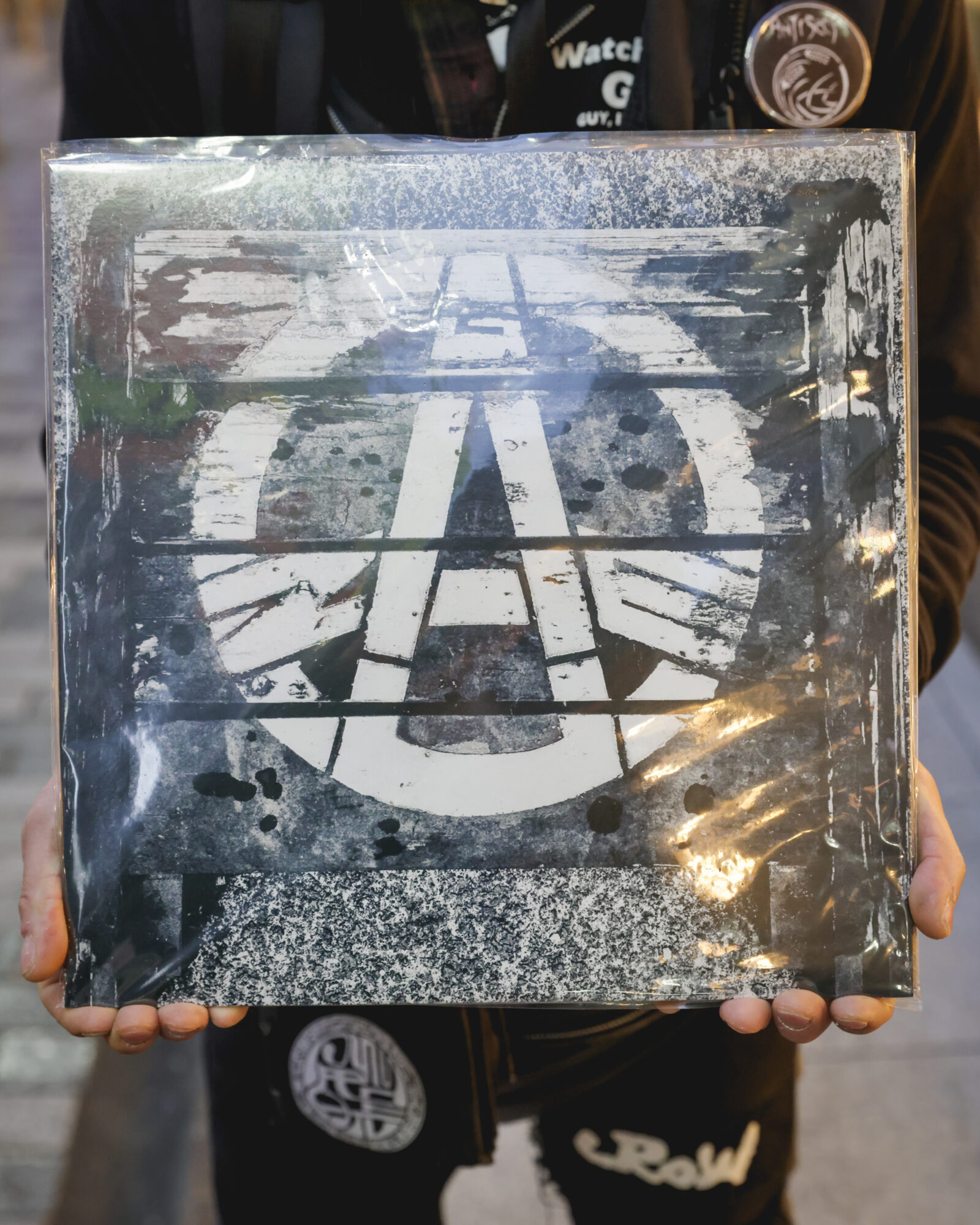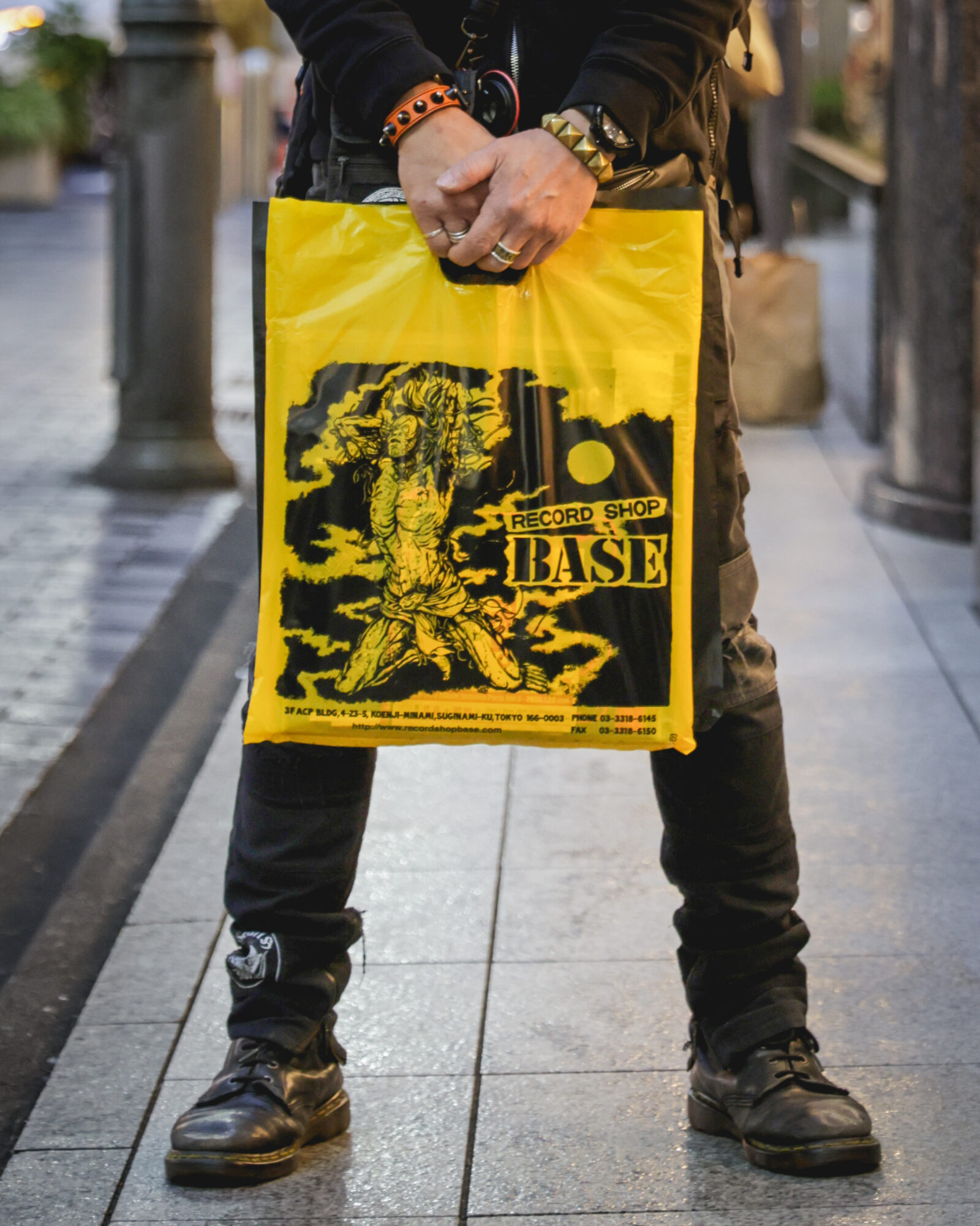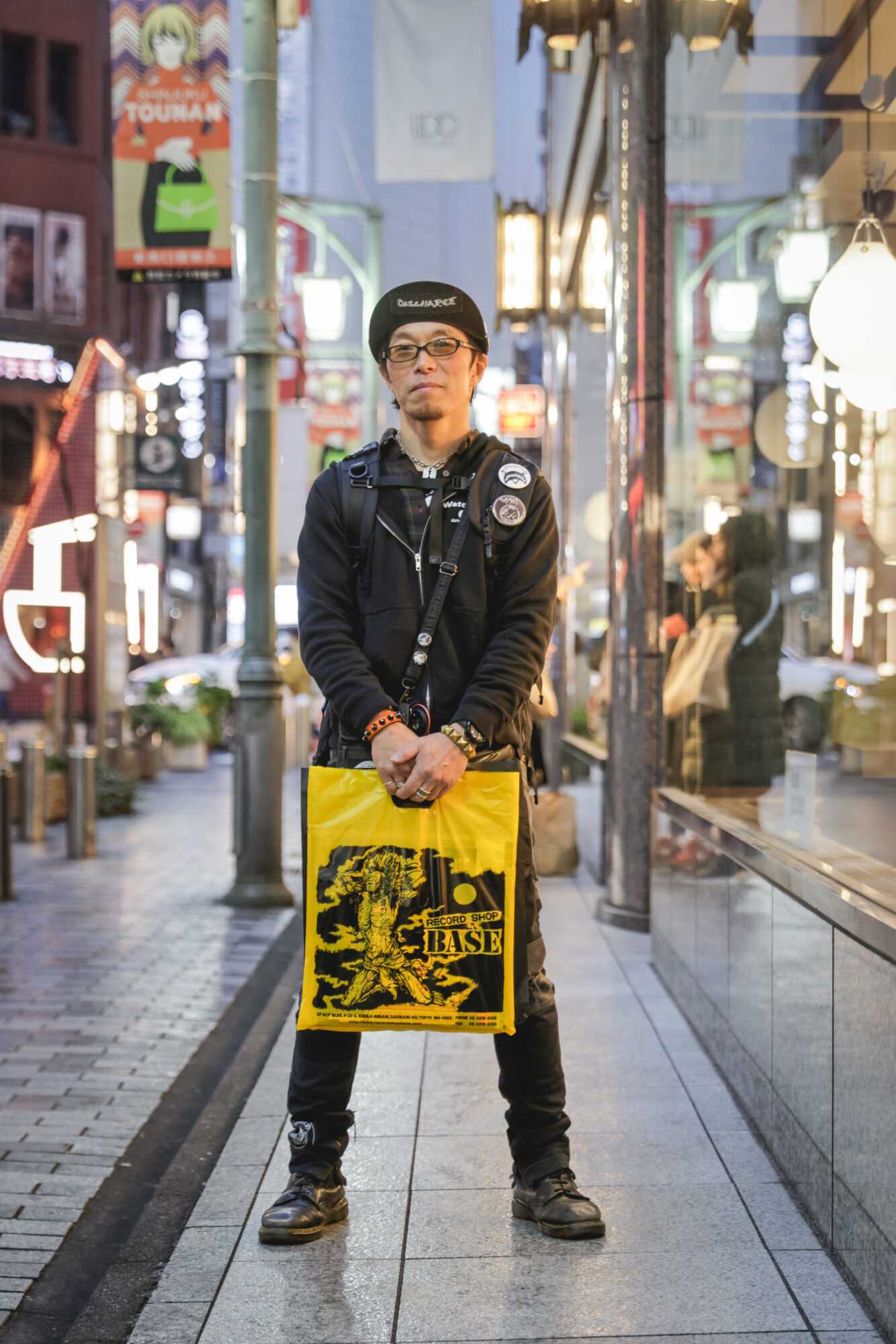 I spotted Taketora san coming out of Record Union in Shinjuku in full head-to-toe punk regalia, holding not only a black and red Union bag but also a bright yellow Record Store Base bag. Such an intriguing character, I had to chat him up and see if he’d pose for a Tokyo Record Style portrait. He instantly obliged me and showed me the records he scored, two hardcore records I was seeing and hearing of for the first time. I’ve since gone home and looked both of them up, finding neither of the albums nor artists on Spotify, proving the point again, as it already has been illustrated through this project, that if you want to explore the full breadth of music out there, you have to look beyond streaming.