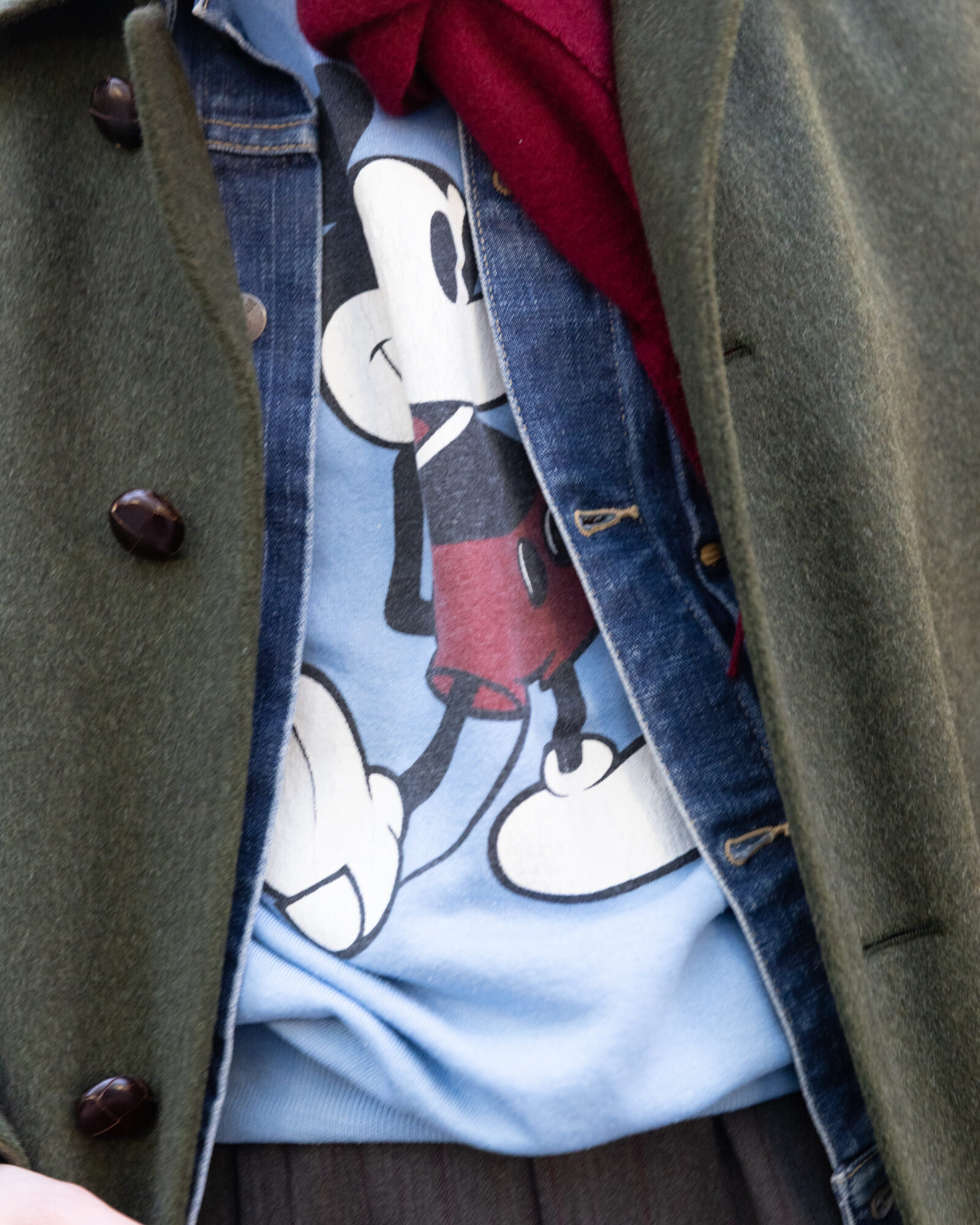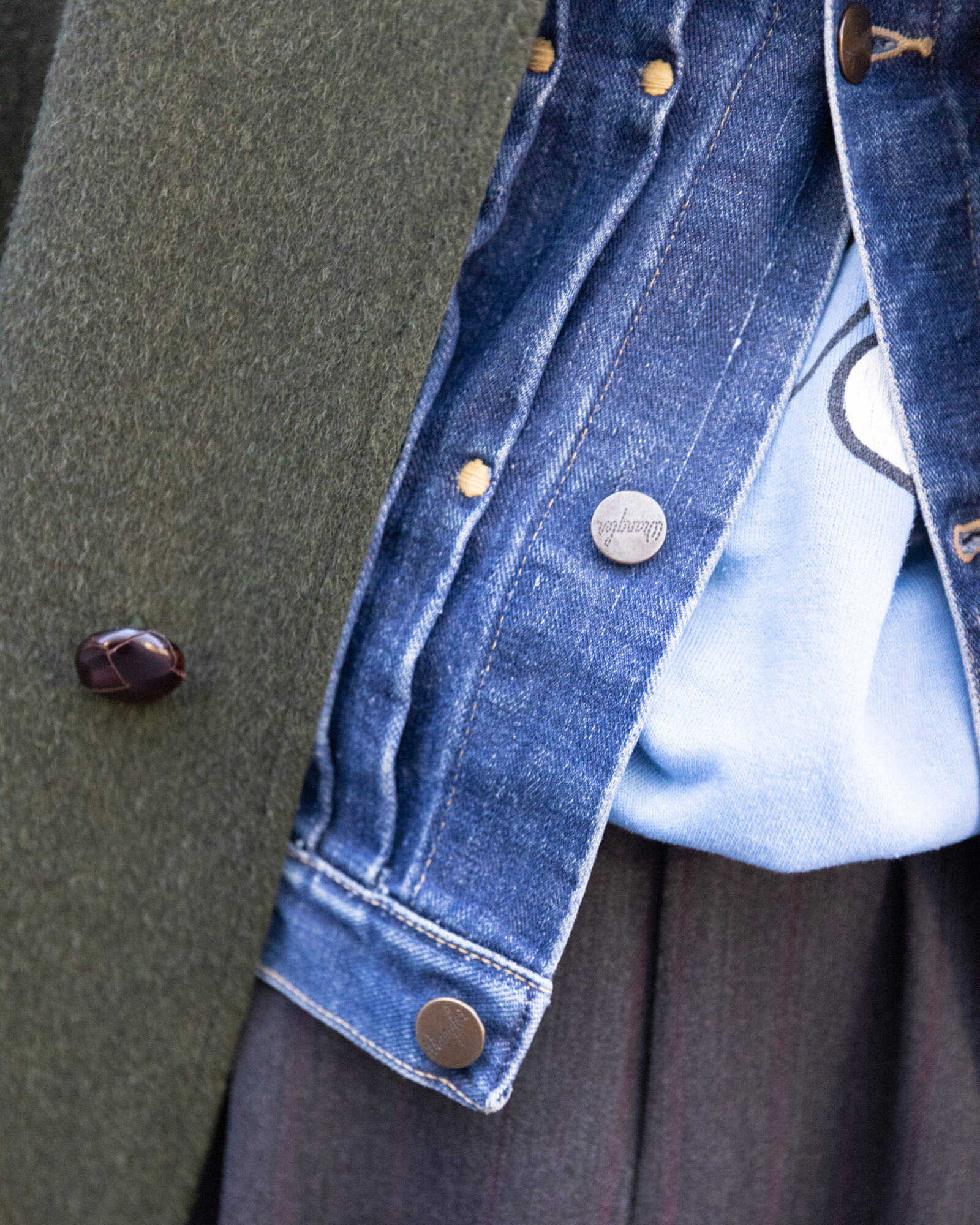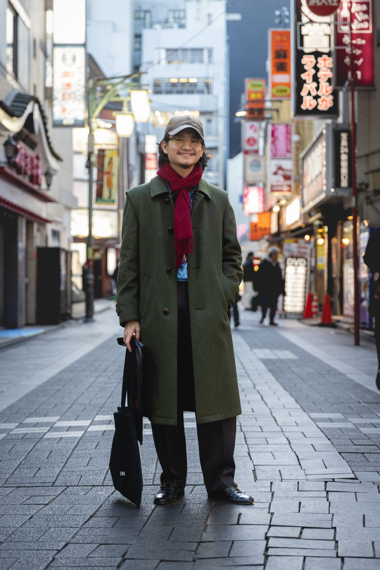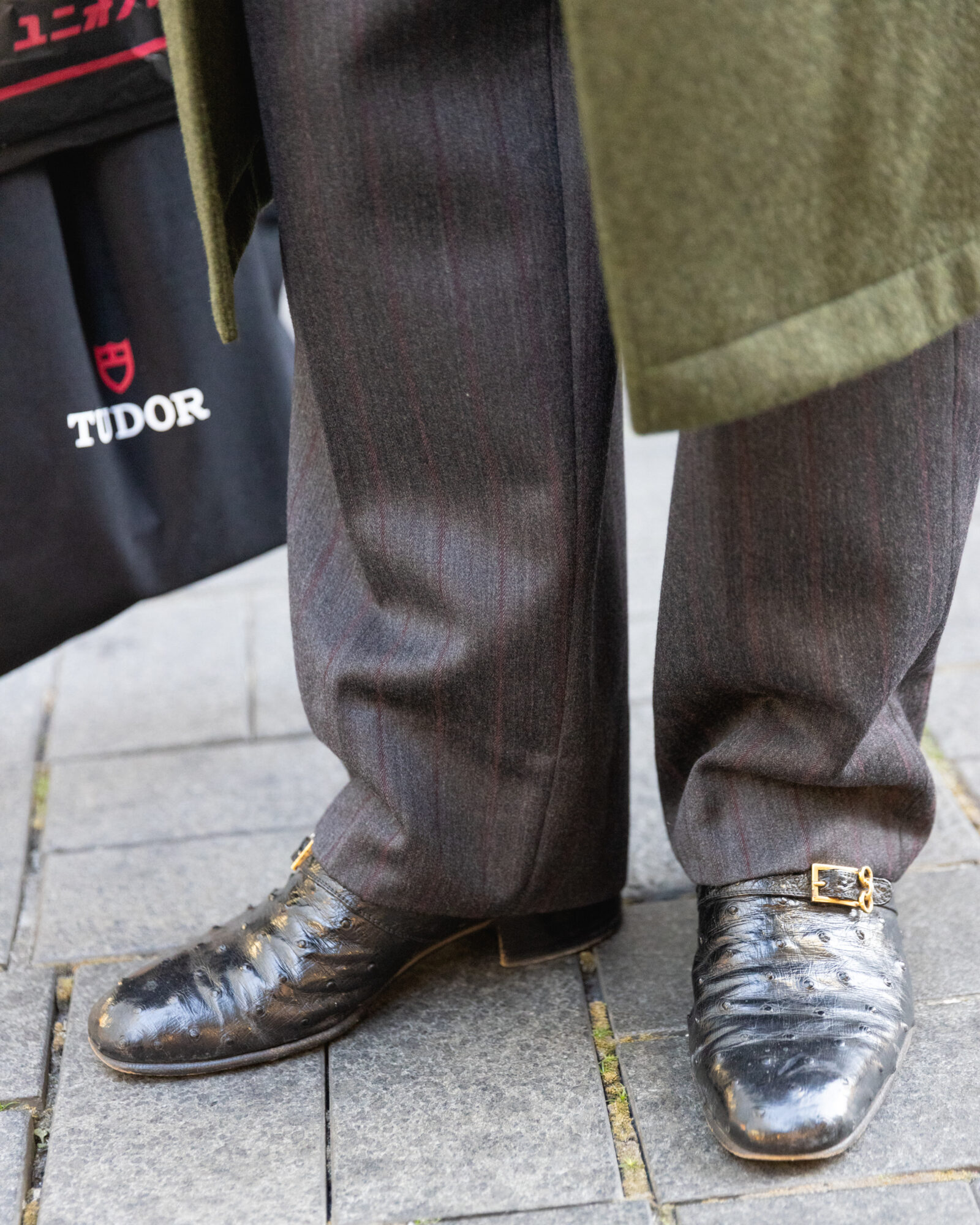 Not only was Takuma rawking some great new records, he was also dressed out in full regalia, looking SHARP. He word a lovely green wool overcoat, replete with the knotted leather buttons, subtly pinstriped tweed trousers, som high-voltage ostrich skin buckle loafers, a vintage Micky Mouse T-shirt, a 40’s or 50s era Wrangler Blue Bell 11MJ, ox-blood wool muffler, a ragtag ball cap, and some vintage British speck, the designer I’ve forgotten, Wow, Takuma! Stealing the show for sure!