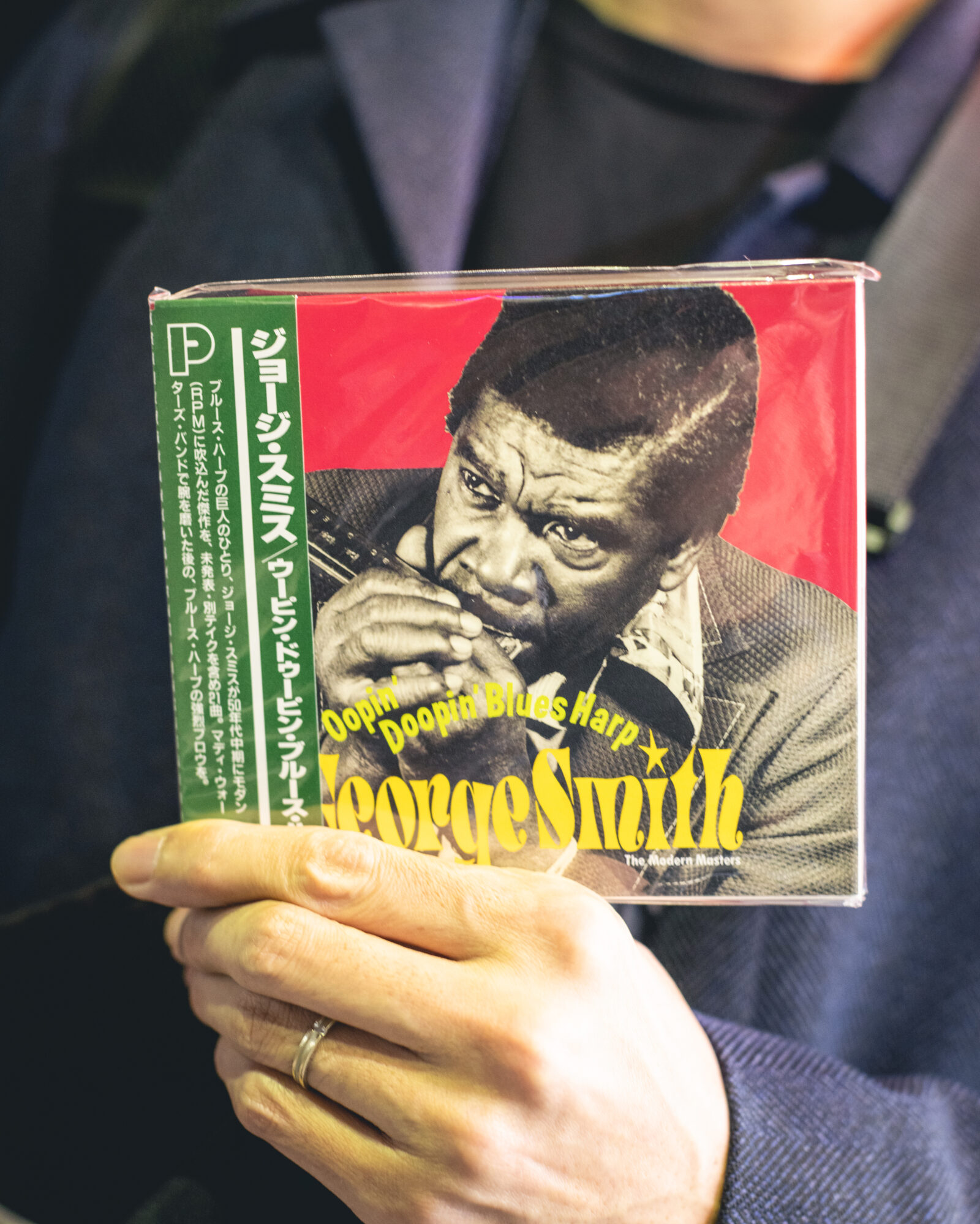 I met Yujiro coming out of Disk Union Shimokita as I was walking in. He was on his way to play a gigi with his band, “Blue Damp”, but stopped to pick up a copy of George Smith’s – Oopin’ Doopin’ Blues Harp before heading there. I wasn’t familiar with George Smith (I have a feeling I’m gonna not be familiar with 90% or more of what I photograph here on Tokyo Record Style) but I did mention owning a handful of harmonicas including a chromatic one, the kind with the button on the side that seems to make playing it with any prowess at all infinitely more complicated. I admitted to Yujiro that I couldn’t really play it, but he said he couldn’t really either.